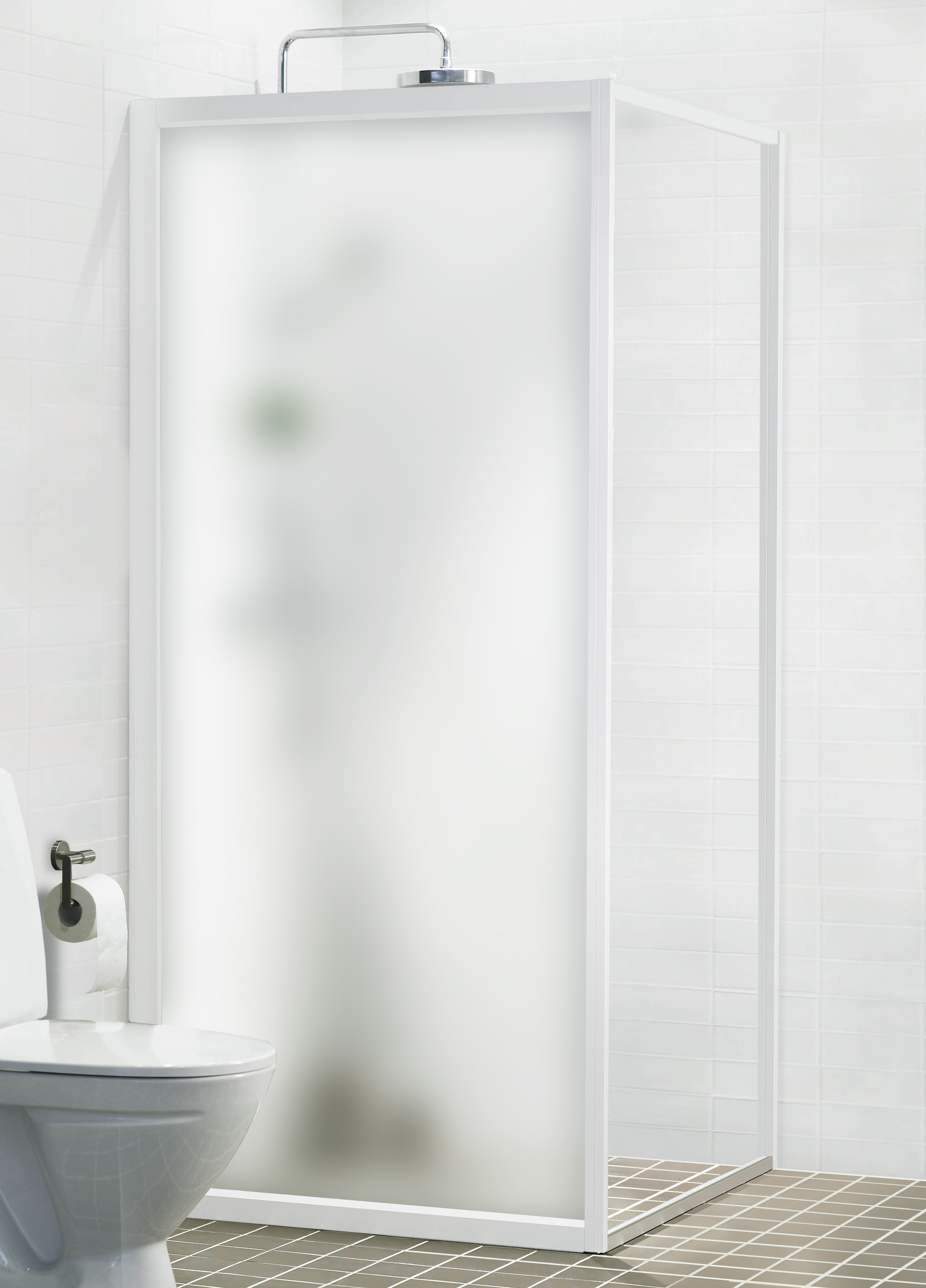 Ifö solid duschvägg fast parti. Stomme av vita aluminiumprofiler och väggar av Frostat härdat säkerhetsglas.