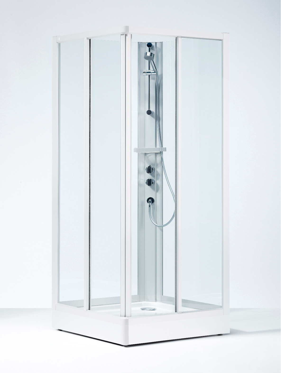 På bilden: Komplett Ifö Solid SKH VK 90x90cm med vitlackerade aluminiumprofiler och klart härdat säkerhetsglas