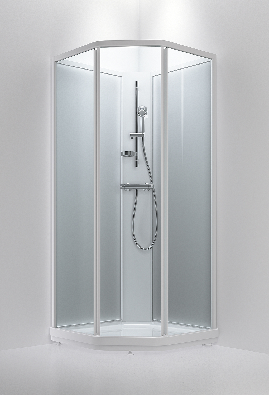 BRIC 2 duschkabin har matt vita profiler och klart glas i front för ett sobert useende, samtidigt som dess frostade bakväggar döljer eventuellt bakomliggande rör.