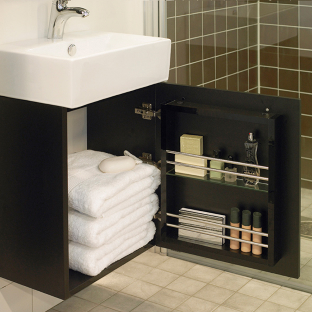 NORO Single är en liten, snygg och smart möbel med ett innovativt förvaringsfack på insidan av luckan. Möbeln passar bäst i det mindre badrummet eller på en gästtoalett.