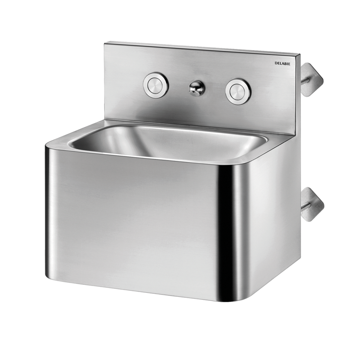 Tvättstället är i borstad rostfri stålplåt: 1,2 mm tjock med rundade kanter och avsedd för genomgående väggmontage.
