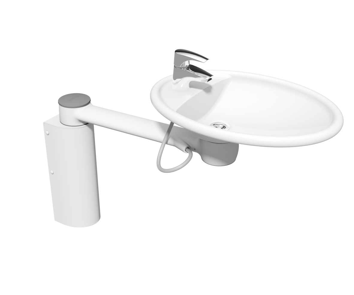 Svingbar vask i fast højde med 180 graders svingbar arm samt ekstra 180 graders rotation af den ovale vask. Indbygget gribekant i vask. Fastmonteret. Inkl. armatur. Vandlås ikke inkludere. Kan kombineres med dock-In. Max brugervægt 80kg og 245Kg i Dock-In