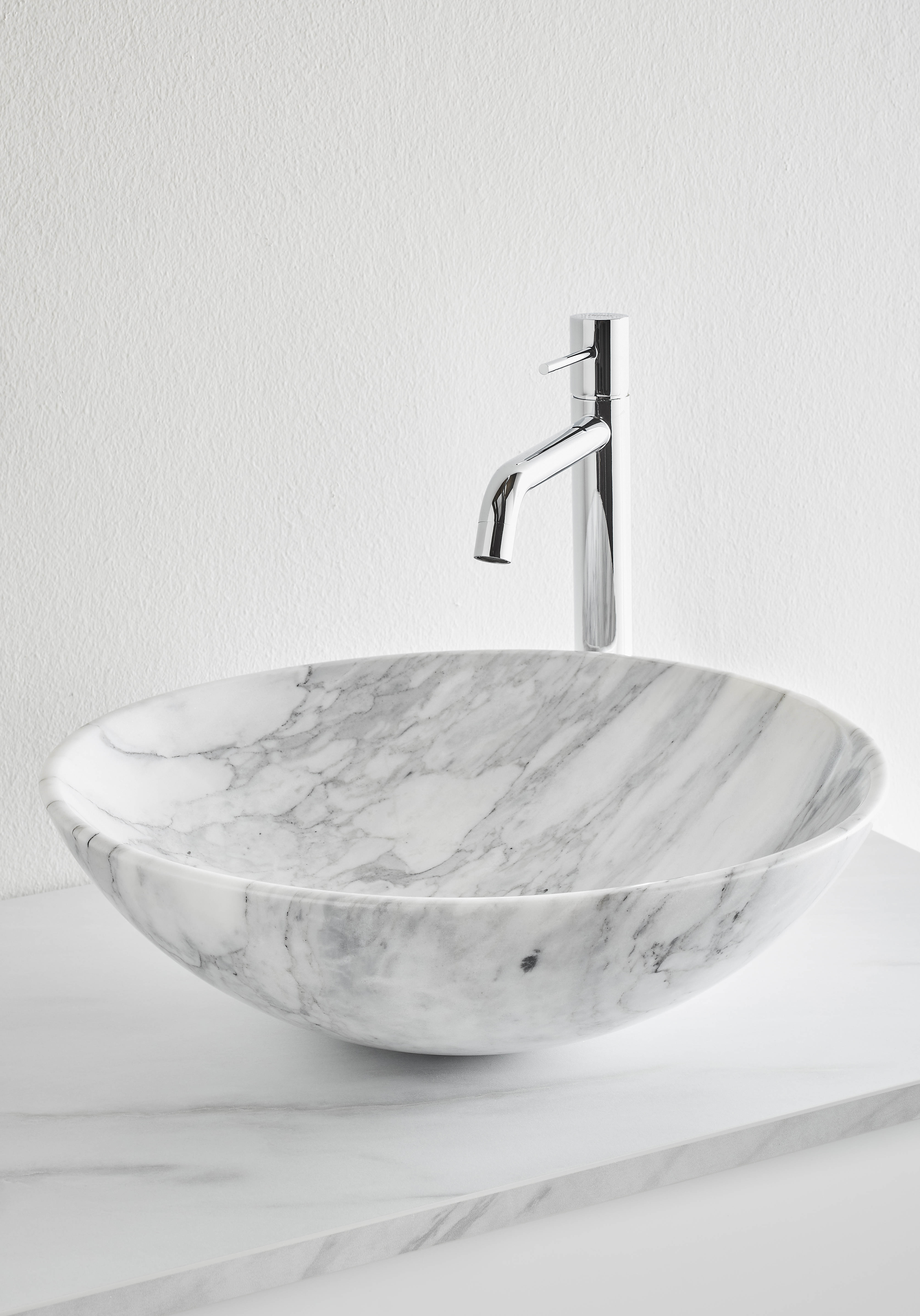 Fristående handfat av solid marmor i fin, klassisk skålform. Varje handfat har sin unika marmorering då de är av äkta, solid marmor. Utan överfyllnadsskydd. Köp till bottenventil och vattenlås.