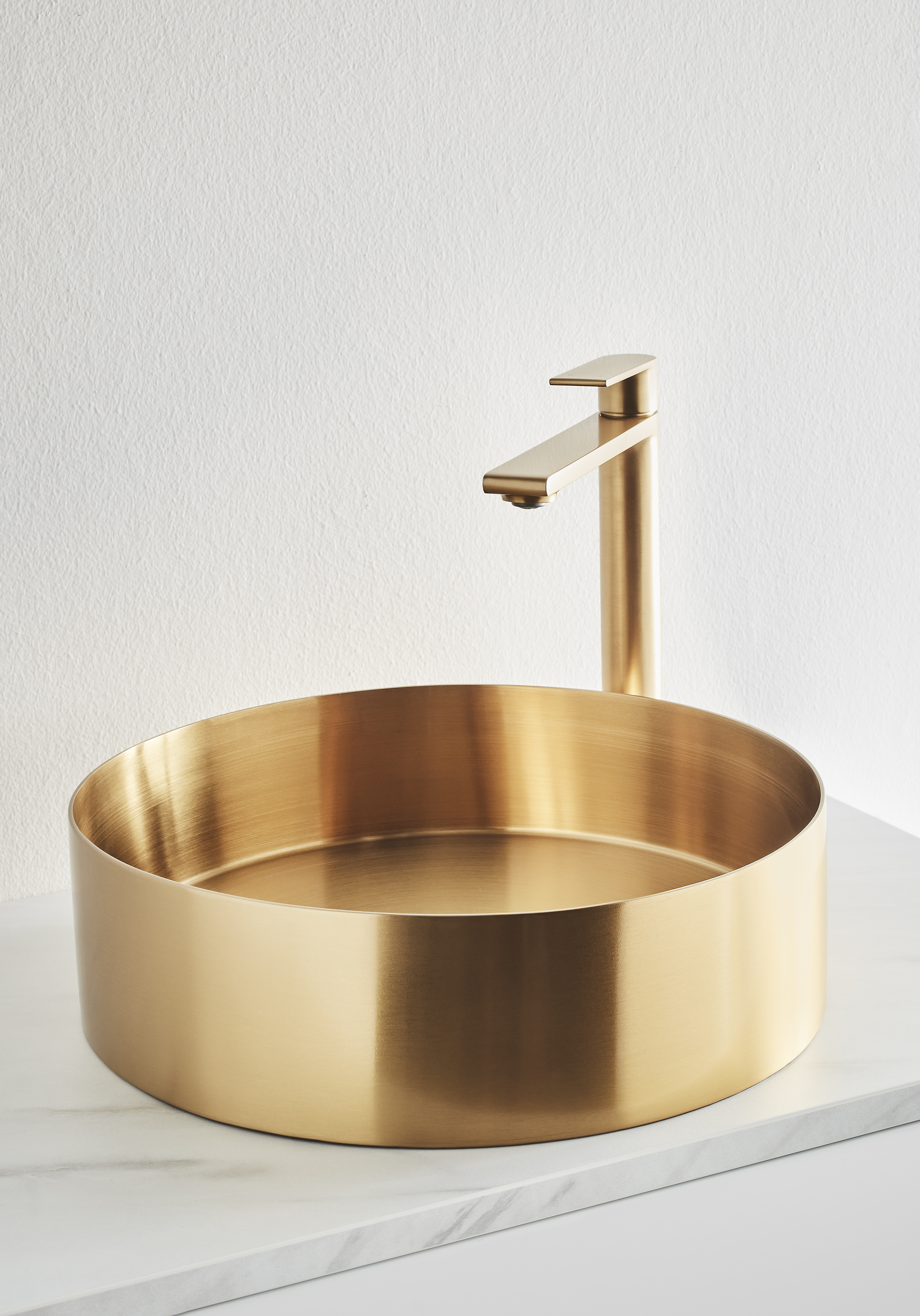 Fristående handfat av rostfritt stål med borstad PVD-finish. Finns i färgerna mässing, koppar och svartkrom. Utan överfyllnadsskydd. Bottenventil medföljer. Köp till vattenlås.