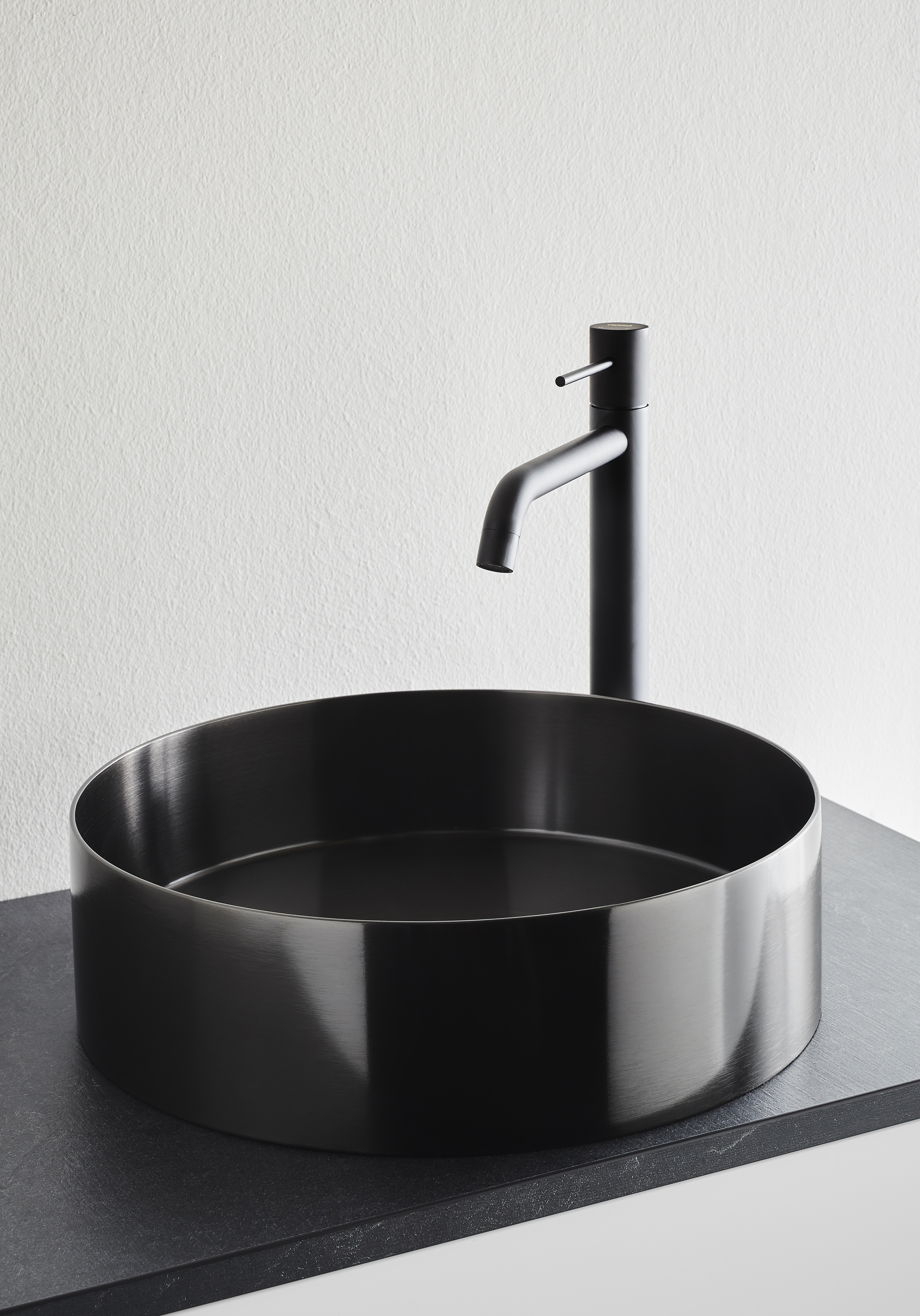 Fristående handfat av rostfritt stål med borstad PVD-finish. Finns i färgerna mässing, koppar och svartkrom. Utan överfyllnadsskydd. Bottenventil medföljer. Köp till vattenlås.