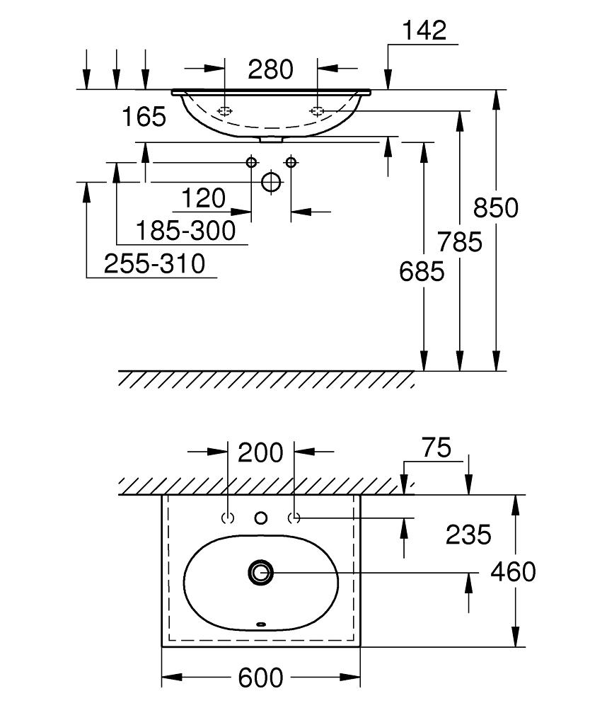 Essence, Vanity basin 60, Vägghängd, 1 hål stansat, 2 hål förstansade, Med bräddavlopp på motsatt sida till kran, Passar mindre enheter, 600 x 460 mm, Sanitetsartikel, PureGuard anit-droppbeläggning och anit-bakteriell glasering