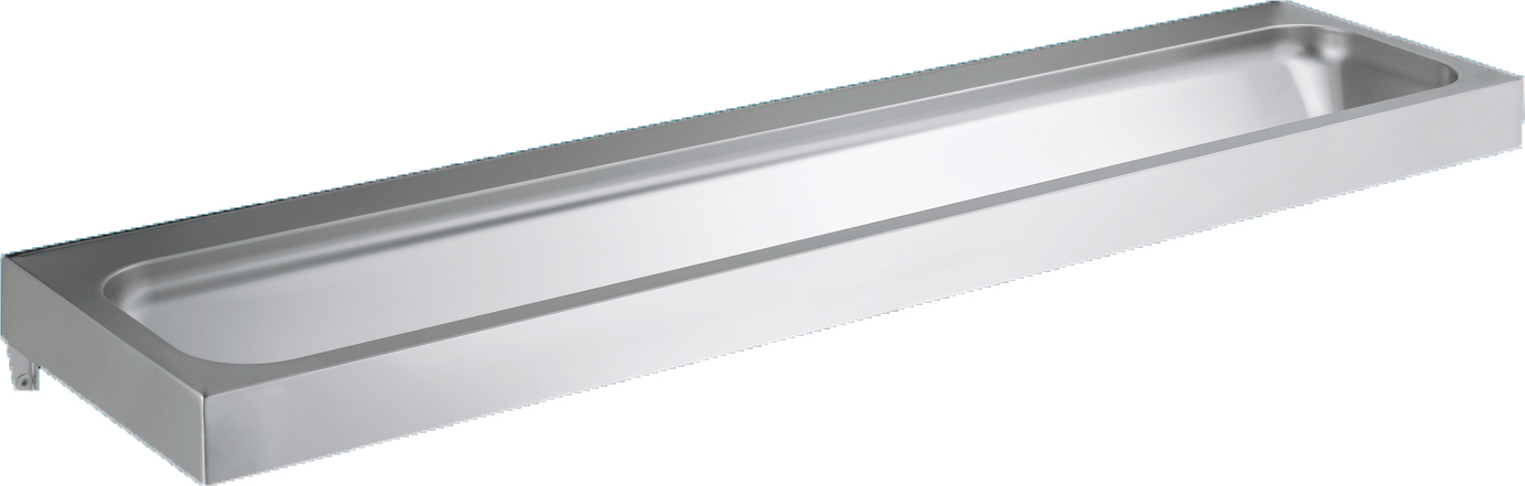 Tvättränna i rostfritt stål med väggkonsol, bottenventil 1 ¼" – 1 ½” med kupad sil, avlopp i mitten och svetsade yttre hörn. För två platser. Stänkpanel ingår ej, beställs separat (P12VP). Längd 1200 mm