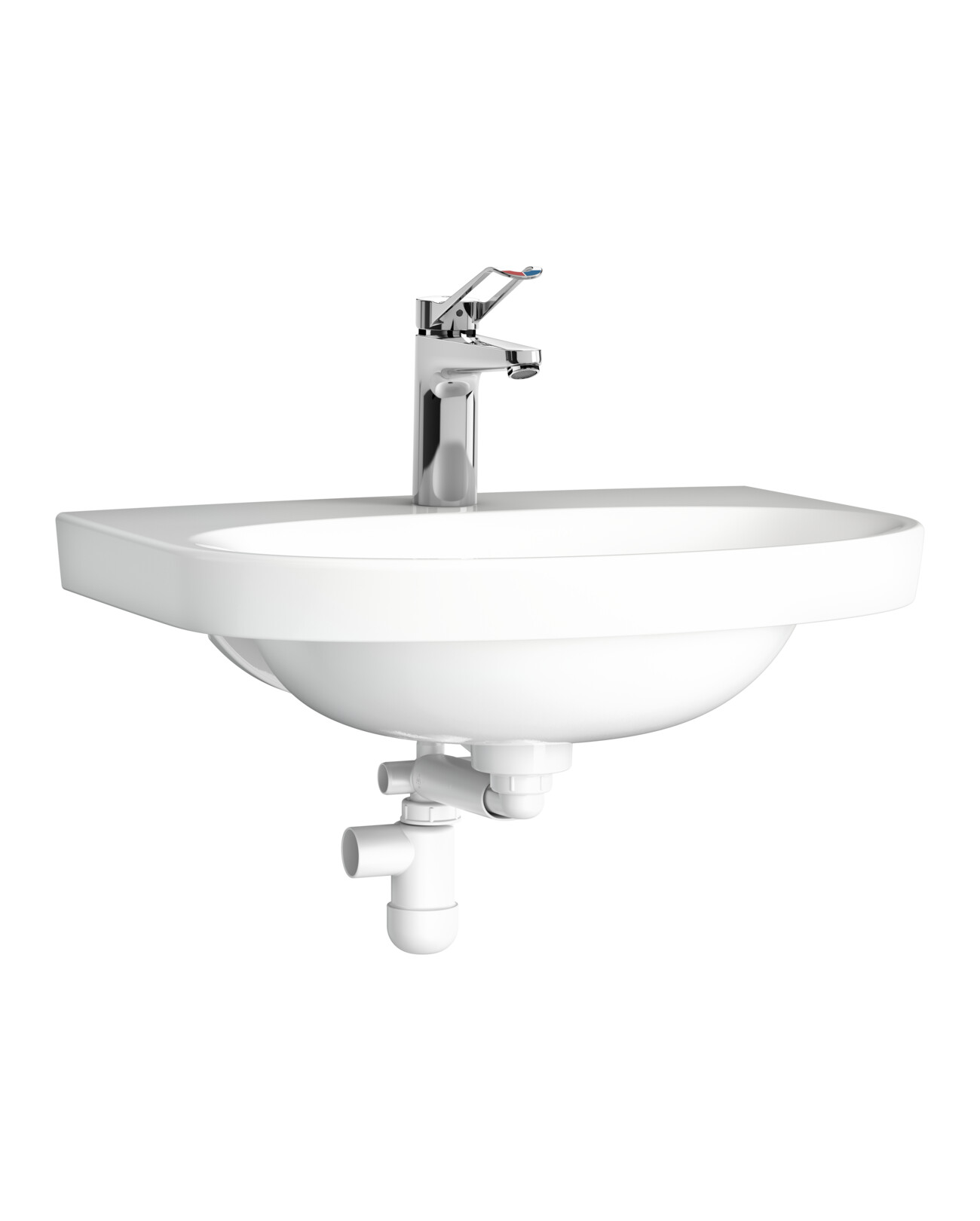 All-in-one-tvättställspaketet är utformat för optimal funktionalitet i vårdrum och har en hygienisk, användarvänlig design med en förseglad bräddavloppskanal, kompakt vattenlås och en lättinstallerad, blyfri blandare som riktar vattenflödet framför silventilen.