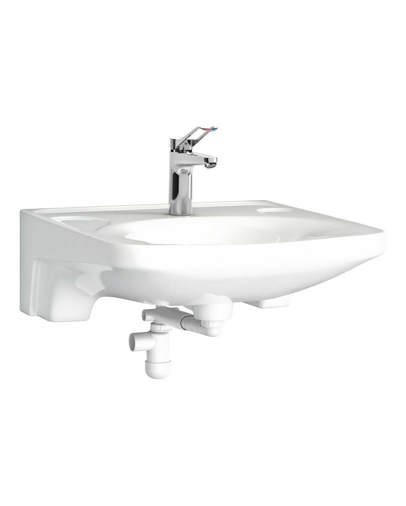 All-in-one-tvättställspaketet är utformat för optimal funktionalitet i vårdbadrum och har en lätttillgänglig, hygienisk och användarvänlig design med 60 cm bredd och djup, kompakt vattenlås och en lättinstallerad, blyfri blandare som riktar vattenflödet framför silventilen.