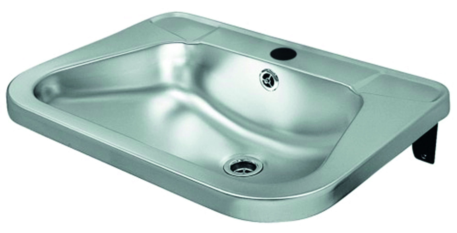 Tvättställ i rostfritt stål med bräddavlopp, bottenventil och kranhål, utan konsoler. Yttermått: 560x420 mm.