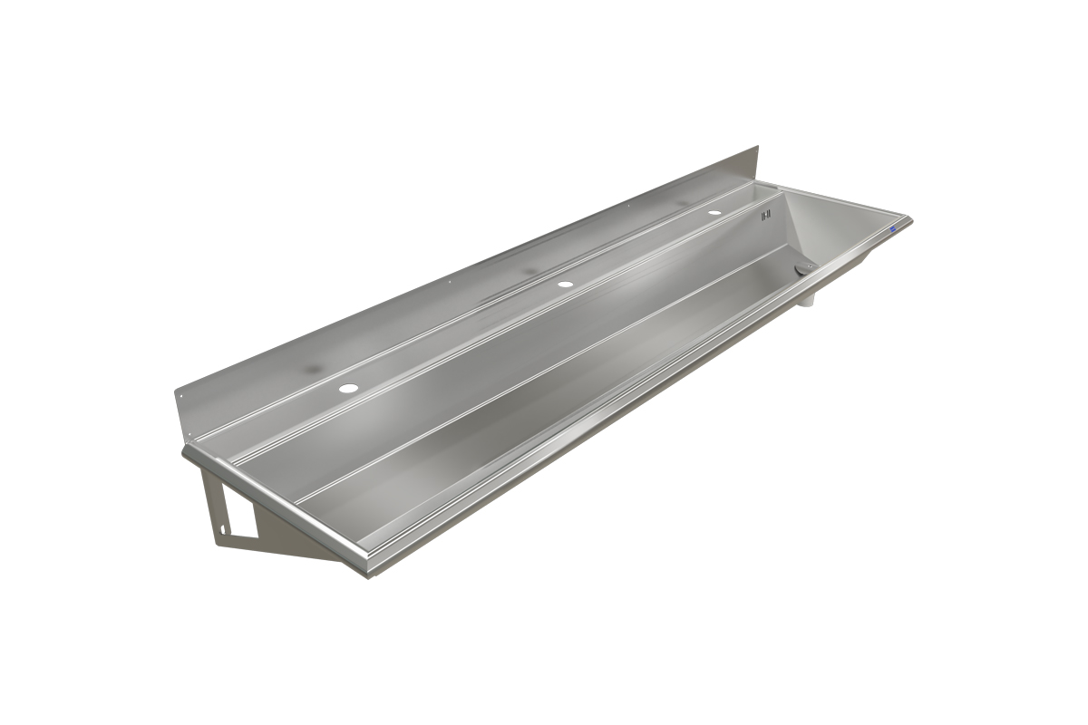 FURO 405. Längd 1800 mm, utlopp vid höger gavel. Av rostfritt stål. Inkl. rostfria konsoler.