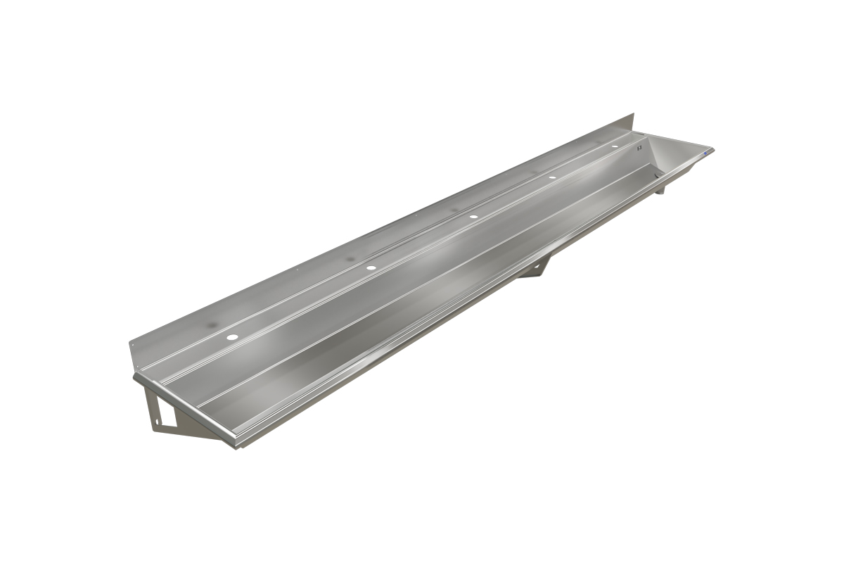 FURO 405. Längd 3000 mm, utlopp vid höger gavel. Av rostfritt stål. Inkl. rostfria konsoler.