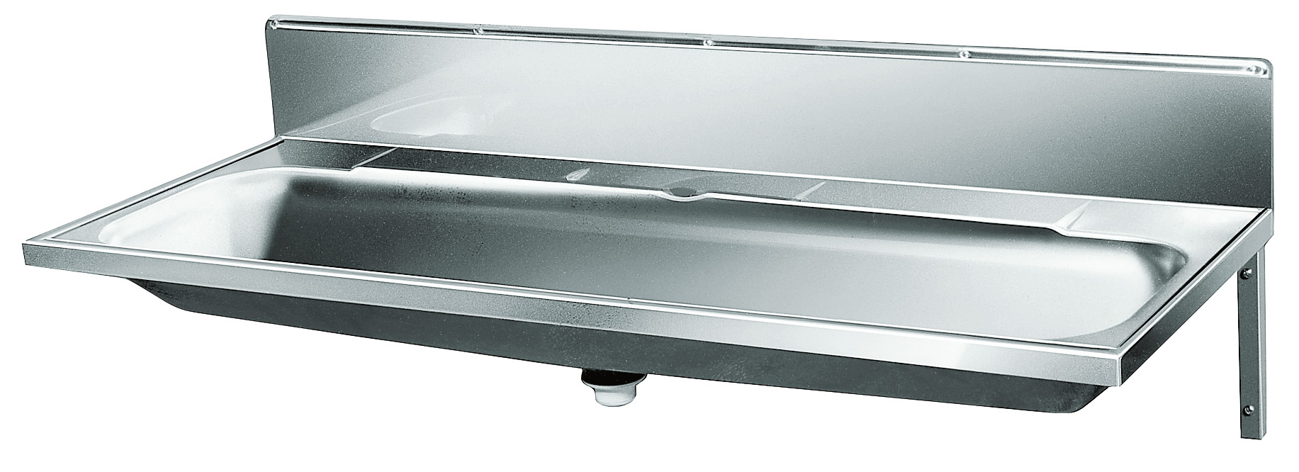 Tvättränna i rostfritt stål med konsoler, stänkplåt och centrerad bottenventil 1 ¼" – 1 ½” med kupad sil. För tre platser. Längd 1800 mm