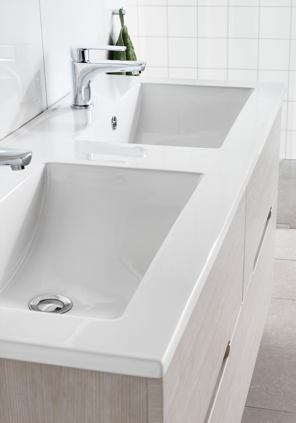 Tvättställ i porslin, mått 1200, med rektangulär ho och överfyllnadsskydd. Tvättstället i mått 1200 finns med en eller två blandare. Komplettera med bottenventil. Tvättstället kommer i vitt.