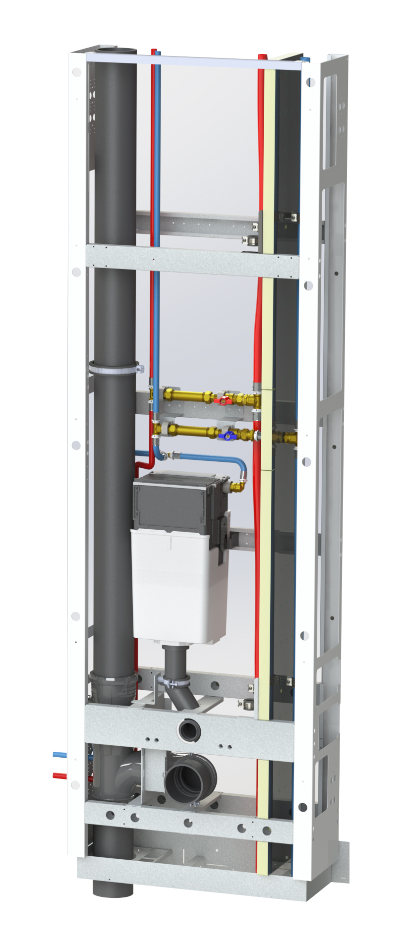 Våtrumskassett för snabbt och säkert stambyte i fastighet, modell fristående vänster. Stomme i vitlackerat stål 2150 mm hög och 690 mm bred. Levereras komplett med monterad avloppsstam, spigot valvgenomföring, konsol förberedd för vattenmätning, dragna och täthetskontrollerade internrör med önskat vattenuttag, spolcistern 4/6L för WC. Sitthöjd för WC är 450 mm. Stamrör för tappvatten och VVC med isolering. KV stam förlagd i sidoförlängning avdelad mot kassettens huvuddel med isoleringsskiva. Inspektionslucka i vitlackerat stål med enkel/dubbelspolning. Väggmall för upphängning samt mall för håltagning till stammar. Färdigkapade och hålade våtrumsskivor för kakelbeklädnad alternativt beklädnad i plåt. Våra våtrumskassetter är anpassade enligt BBR och säkervatten. Typgodkänd valvgenomföring för anslutning mot över 20 tätskiktssystem.