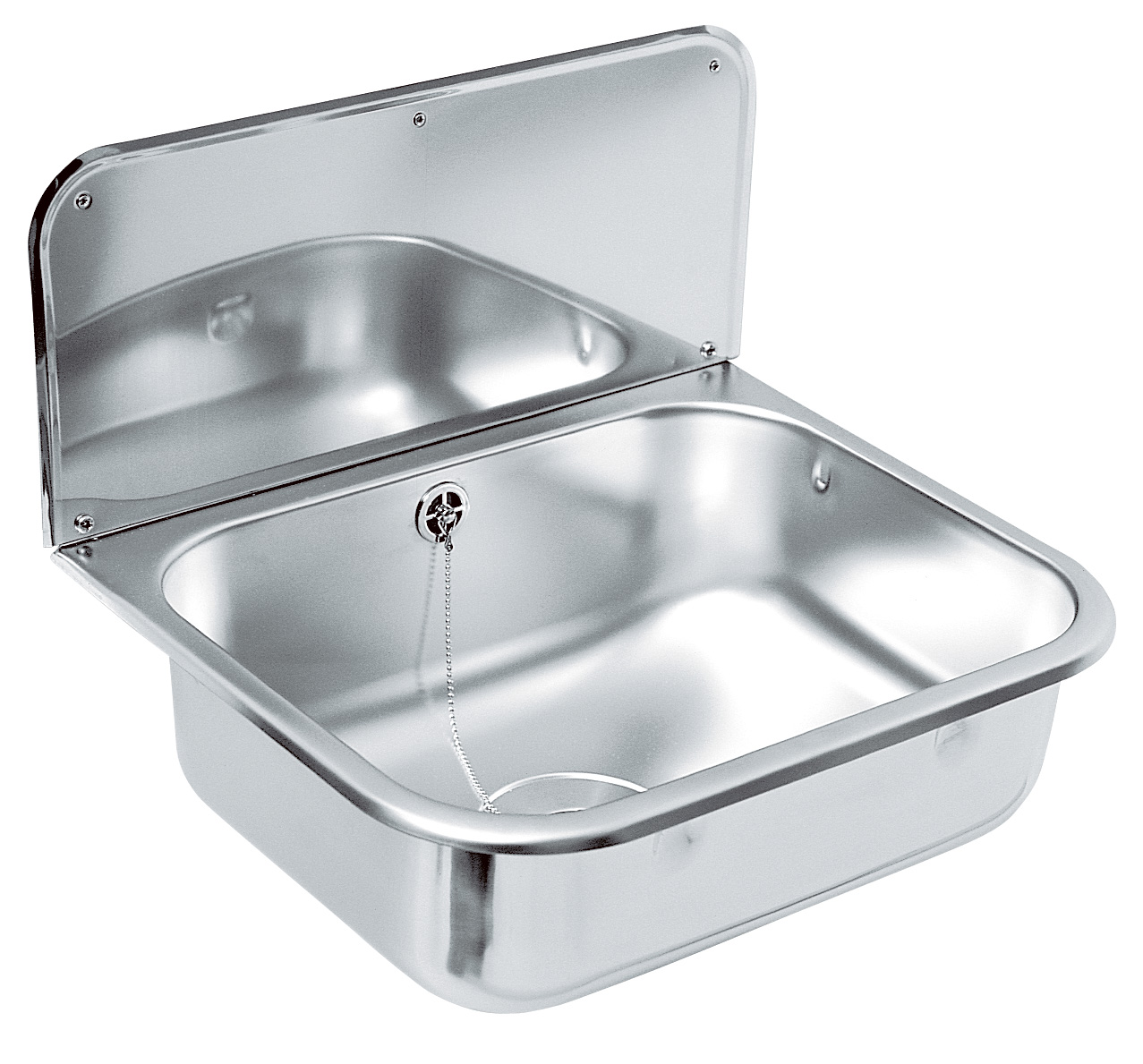 Utslagsback i rostfritt stål. Levereras med konsol, stänkskydd och bottenventil 3 ½” med kupad sil. Yttermått: 490x390x175 mm.
