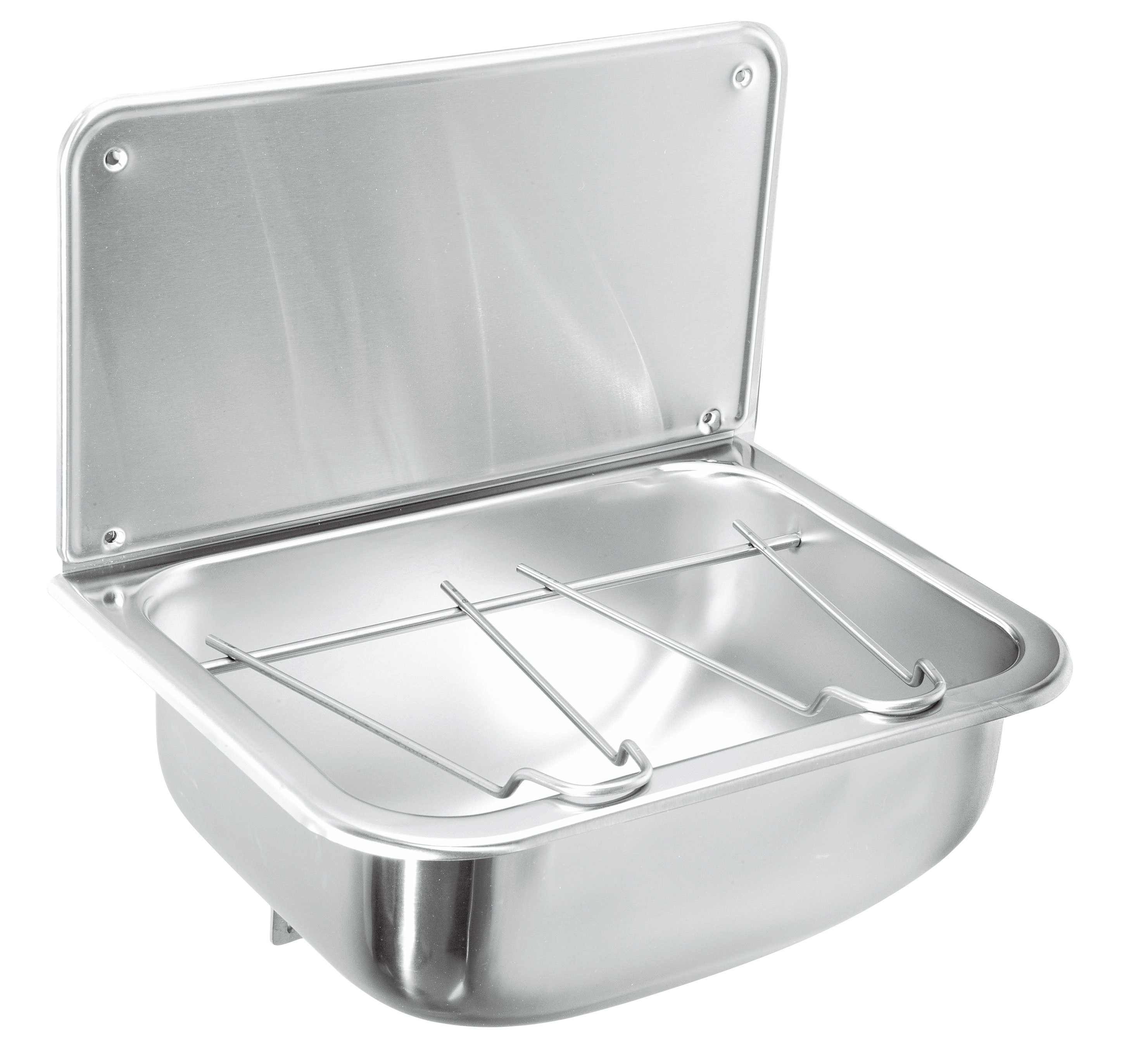 Utslagsback i rostfritt stål. Levereras med konsol, galler, stänkskydd och monterad bottenventil 1 ¼" – 1 ½”. Färdig att montera på vägg och med monteringsmall. Yttermått: 450x330x240 mm.