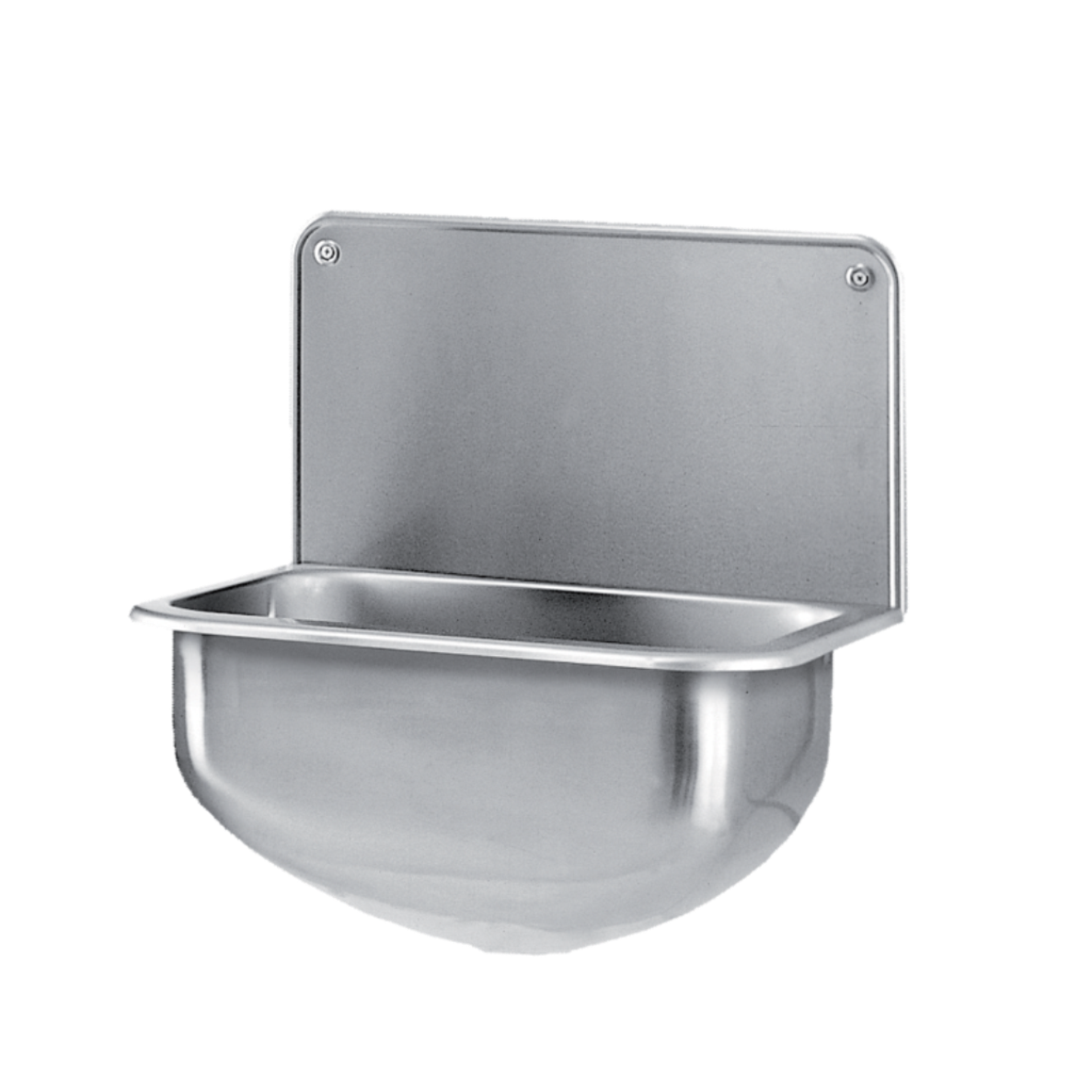 Väggmonterad utslagsback i rostfritt med stänkskydd. Kan kompletteras med galler.