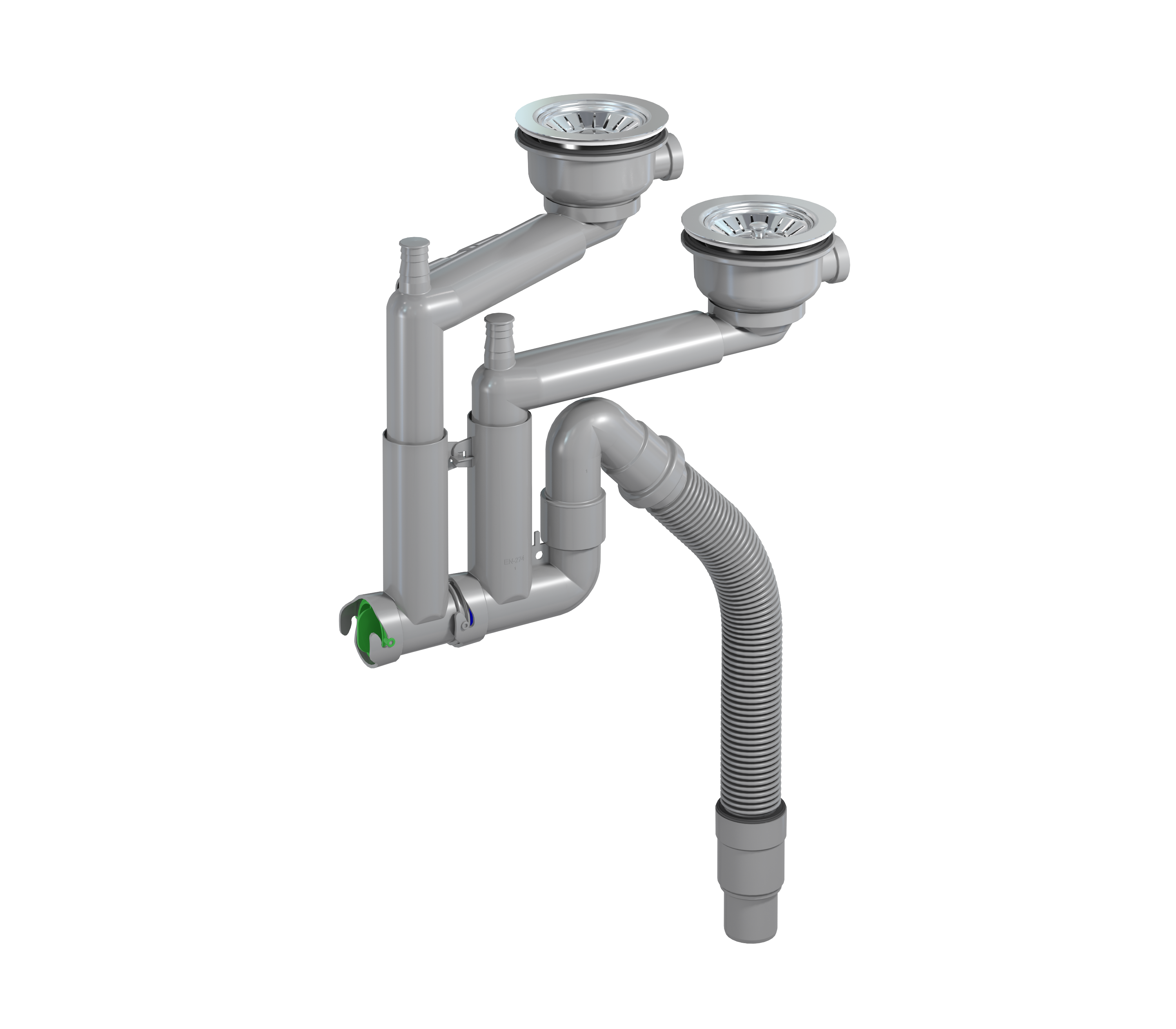 Vattenlås för disklådor, spacesaverarm med korgbottenventiler, diskmaskinsanslutning, rensplugg, kapbar slanganslutning till vägg/golv ø40/50 mm