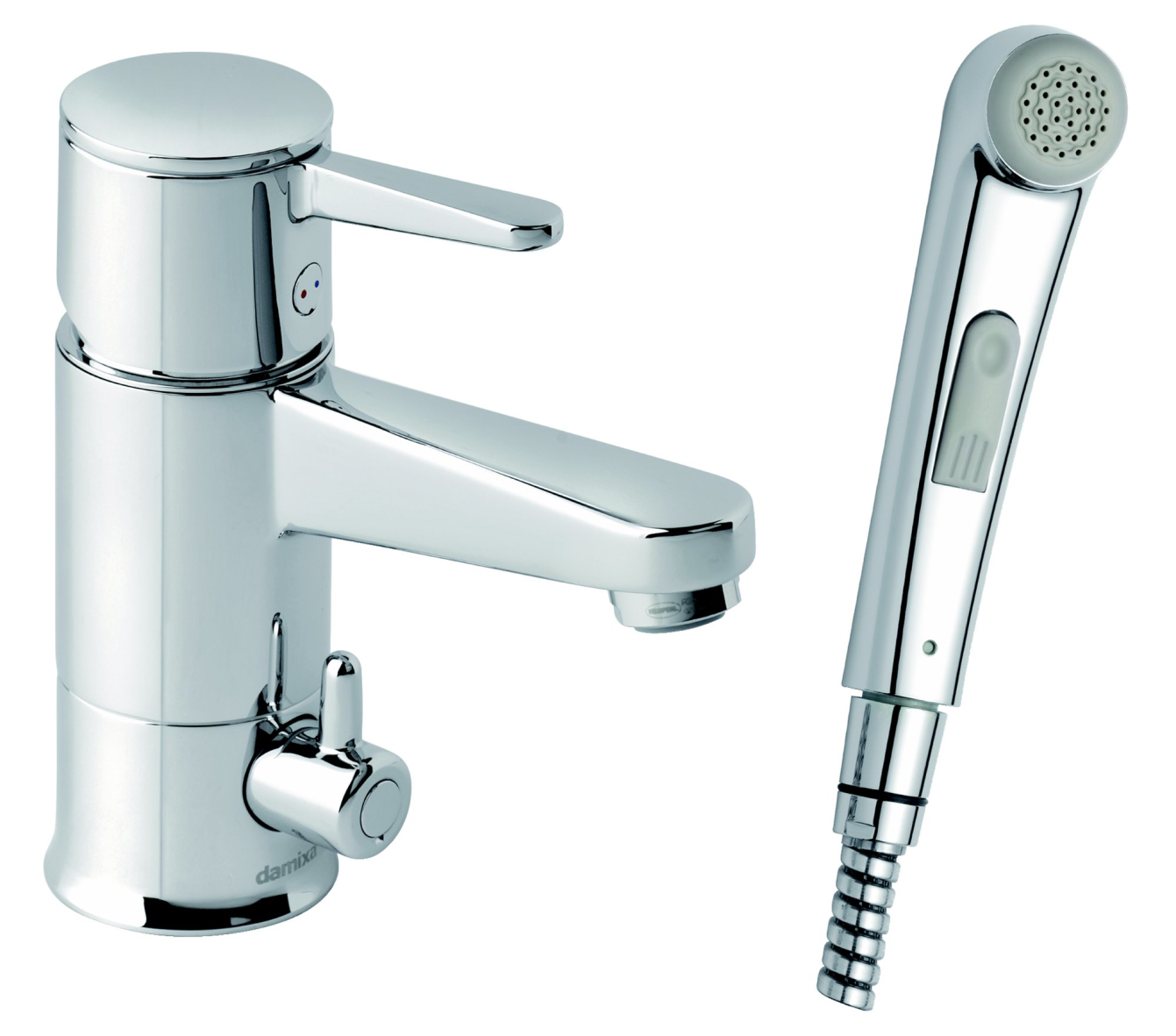 Fern Tvättställsblandare med sidodusch, "Vrid & spara"-funktion, avstängning - utan bottenventil.