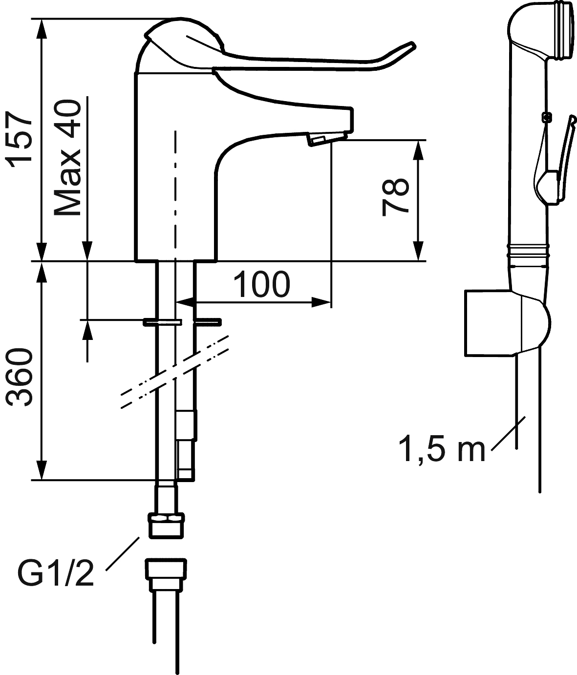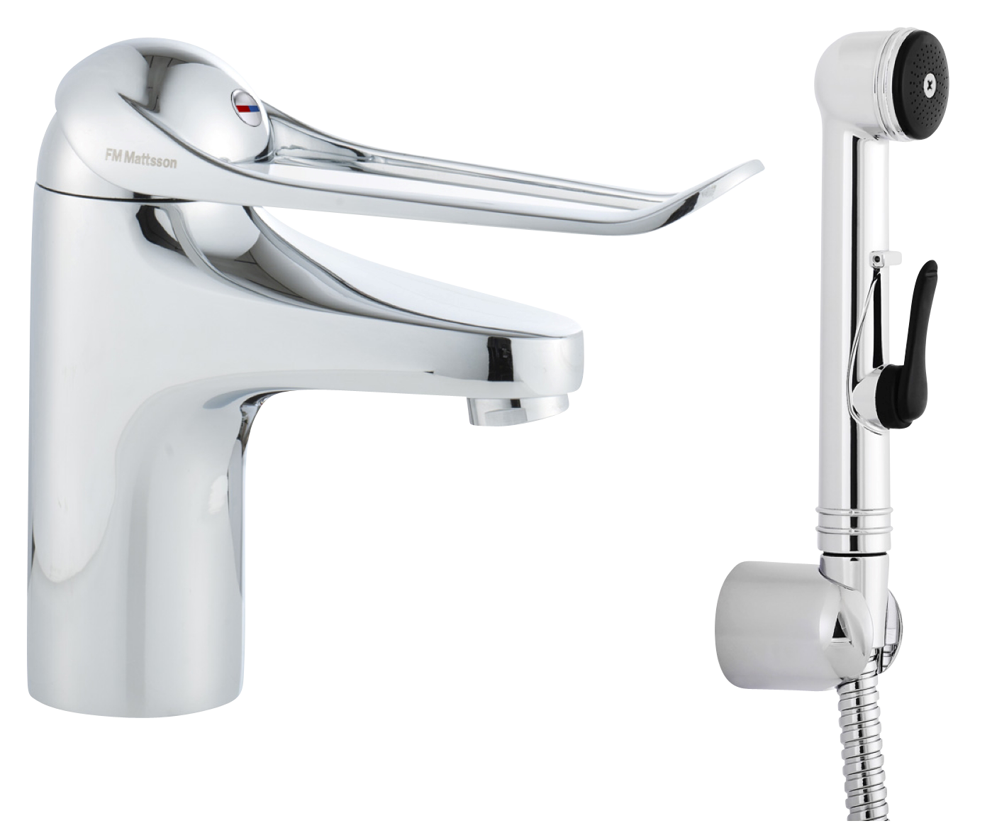Energiklassad tvättställsblandare med självstängande sidodusch, slang och väggfäste. Ekoflöde. Mjukstängning som förhindrar smällar och tryckstötar är standard, liksom kallstart, keramisk tätning och inbyggd temperaturspärr. 5 års tryckgaranti. Här med en extra lång spak på 150 mm.