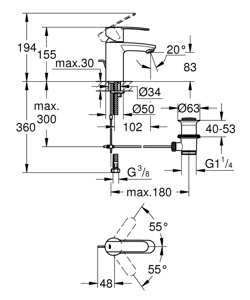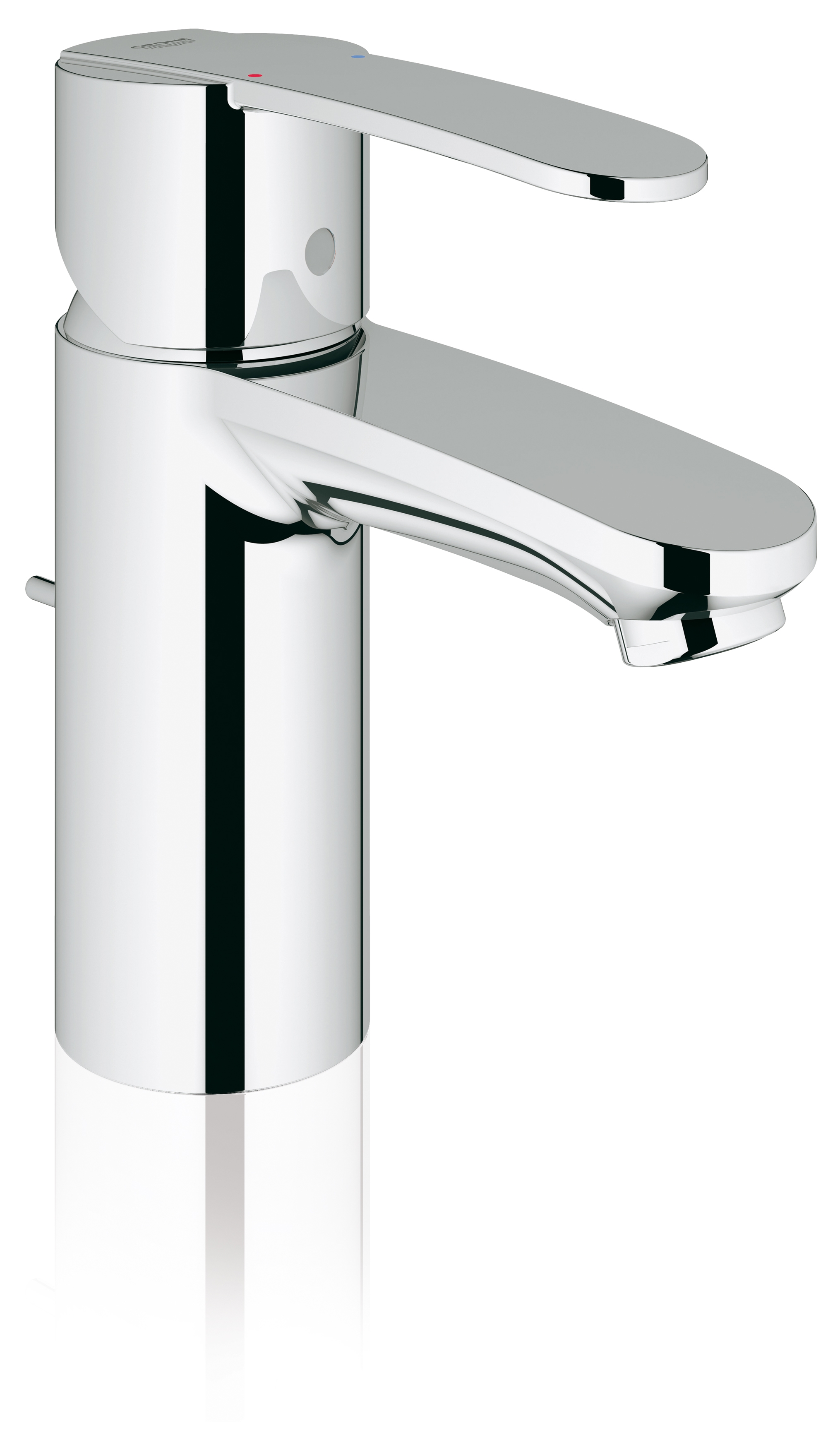 Wave Cosmopolitan tvättställsblandare ettgrepp, DN 15 i storlek S. Tvättställsblandaren är försedd med metallgrepp, GROHE SilkMove 35 mm keramikinsats och GROHE EcoJoy strålsamlare på 5,7 l/min. Flödesbegränsaren är inställningsbar med inställbart minimumflöde på 2,5 l/min och bottenventilen är på 1 1/4". Rengöringen är enkel tack vare den kromade GROHE StarLight-ytbehandlingen och SpeedClean antikalksystem. Installationen sker snabbt och smidigt genom etthålsmontage, flexibla anslutningsslangar och GROHE QuickFix. Temperaturbegränsare finns som tillval.