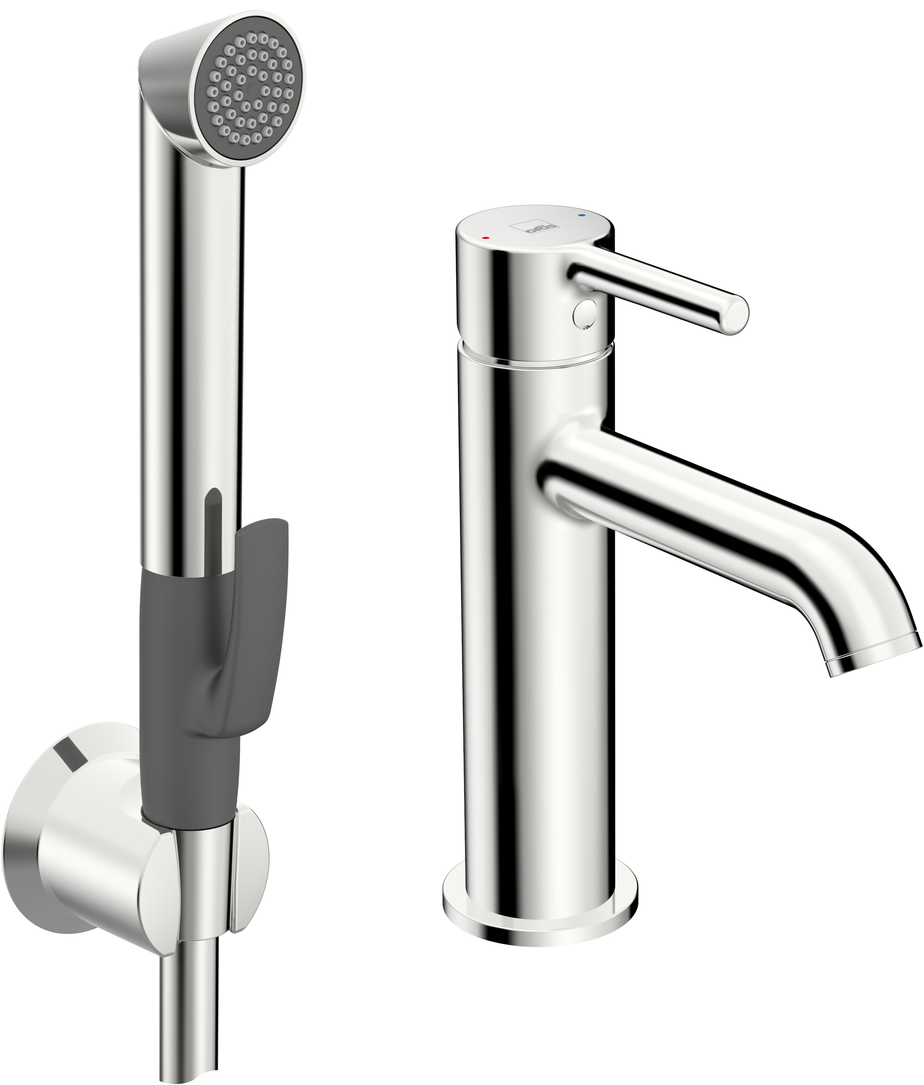 Tvättställsblandare med en användarvänlig pinnspak samt självstängande Bidetta handdusch, slang och väggfäste.