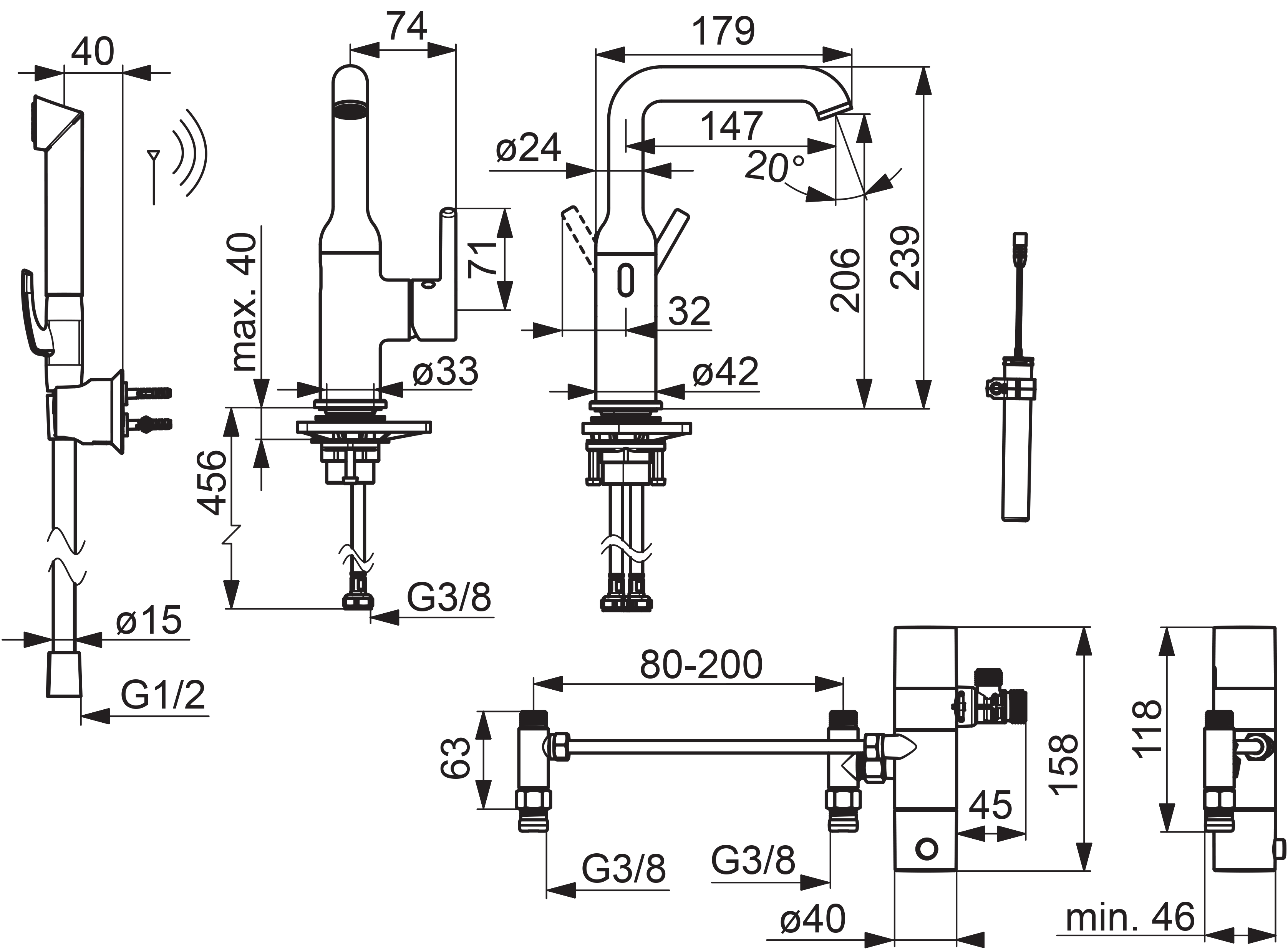 Tvättställsblandare med hybridfunktion (ettgrepps- och beröringsfri funktion), svängbar pip 120°, kontrollenhet med termostat och en fjärrstyrd Smart Bidetta handdusch med duschslang och väggfäste. Batteridrift 3V. F = flexibla anslutningar. Bluetooth anslutning via Oras App för enkel justering av parametrar.