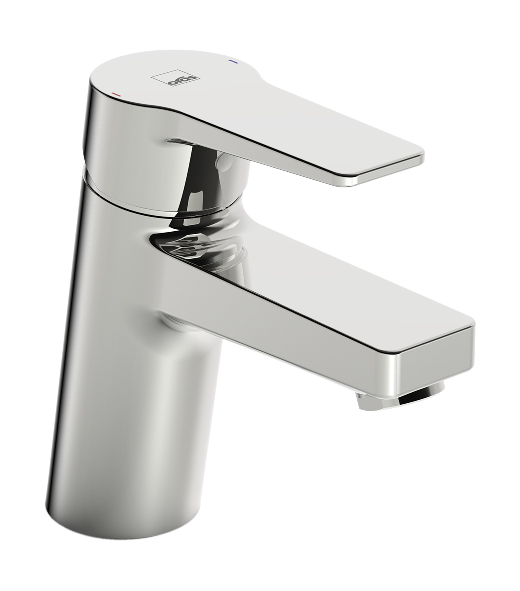 Tvättställsblandare med fast utloppspip och strålsamlare. Inbyggd spärr för begränsning av temperatur och flöde, kallstartskassett, flödeskontroll 5.0 l/min. Energiklass A