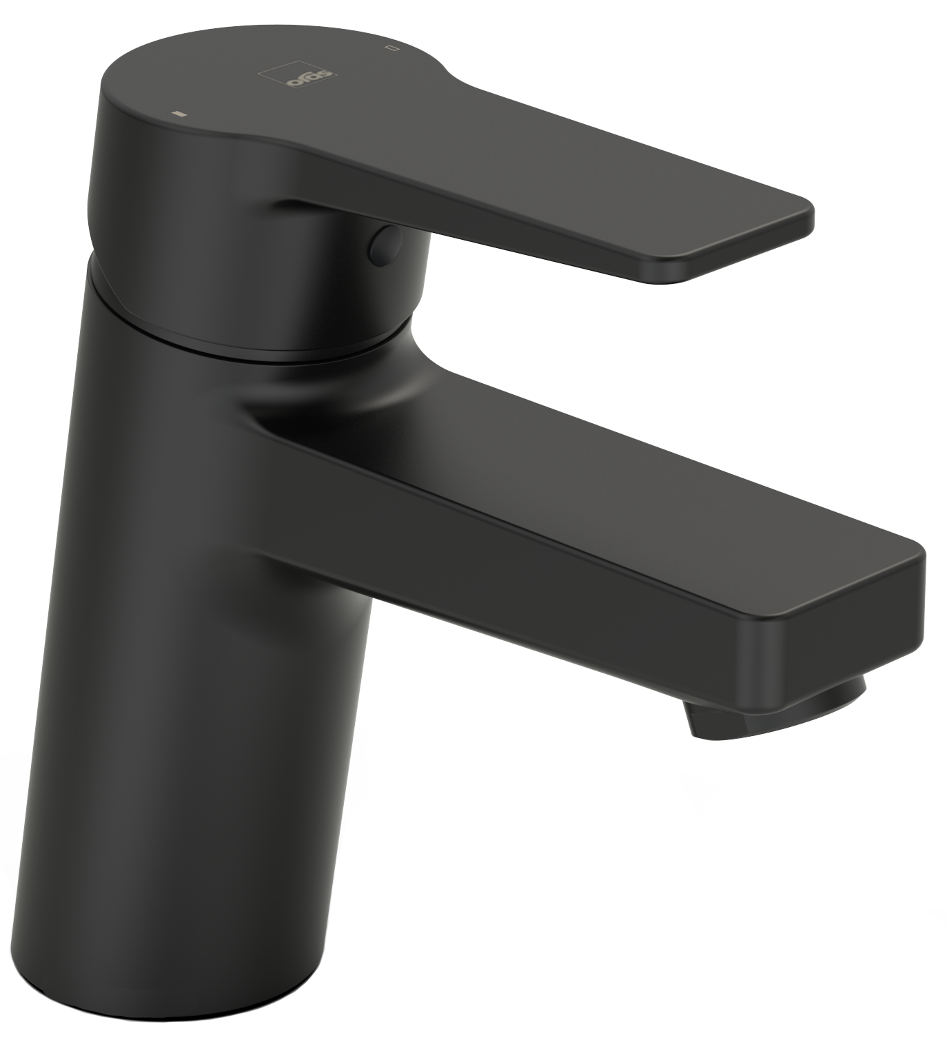 Matt svart tvättställsblandare med fast utloppspip och strålsamlare. Inbyggd spärr för begränsning av temperatur och flöde, kallstartskassett, flödeskontroll 5.0 l/min. Energiklass A