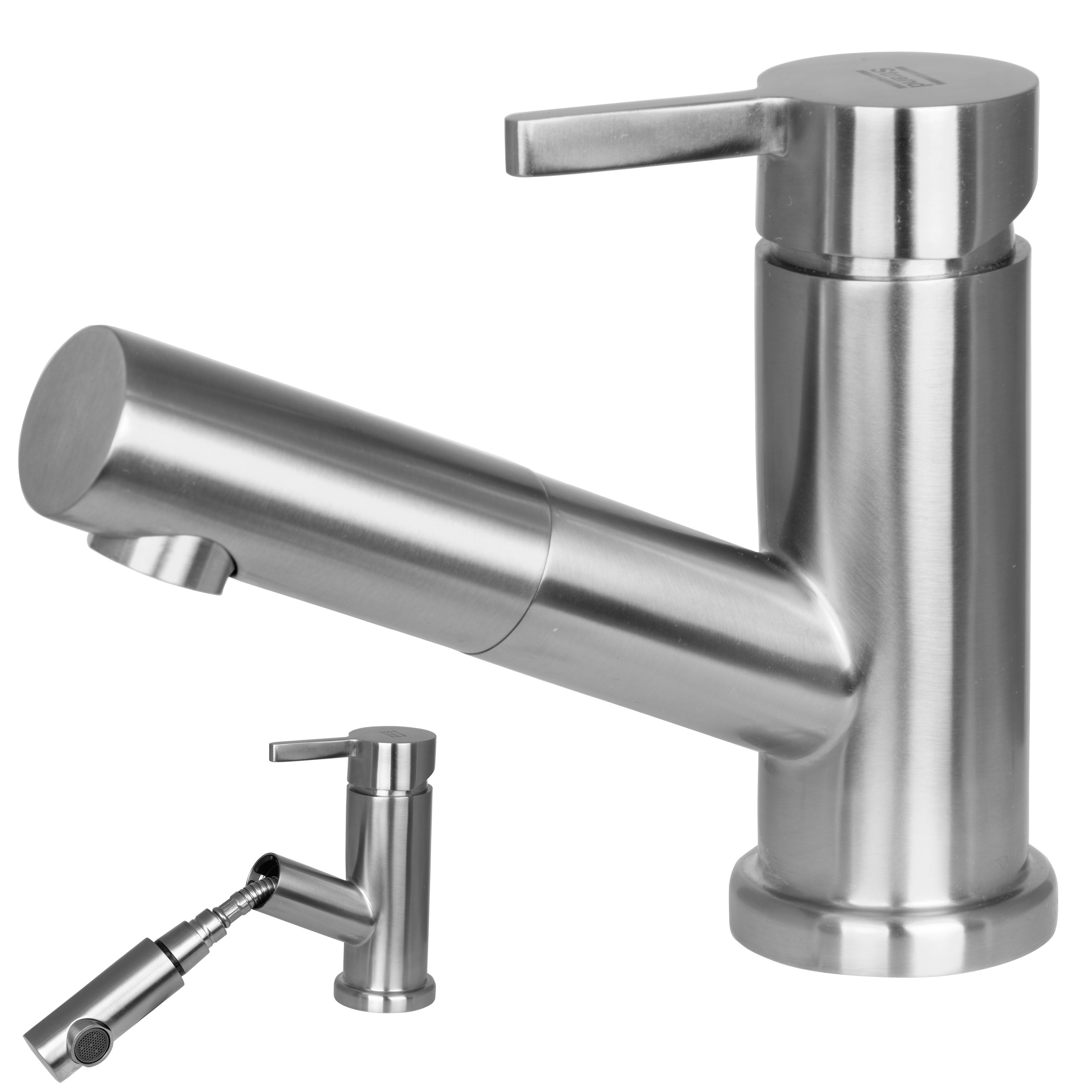 Rostfri tvättställsblandare med utdragbar handdusch, softpex anslutningar.