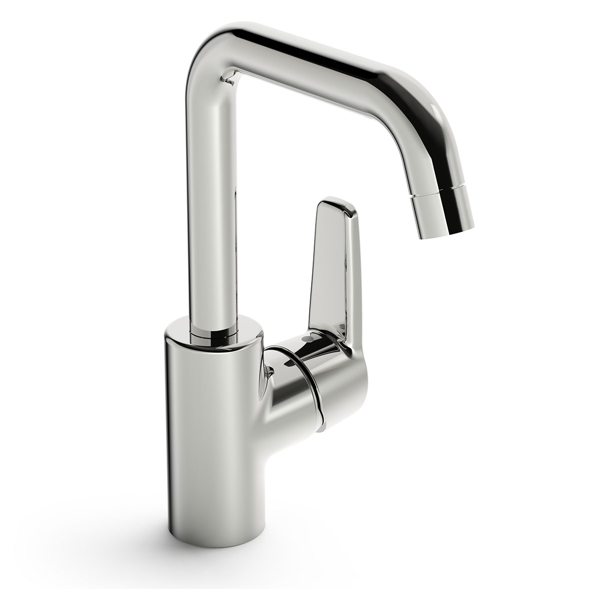 Tvättställsblandare med sidospak, hög svängbar utloppspip. Inbyggd spärr för begränsning av temperatur och flöde. Flödeskontroll 6.0 l/min. F=flexibel anslutning. G3/8" inv.G