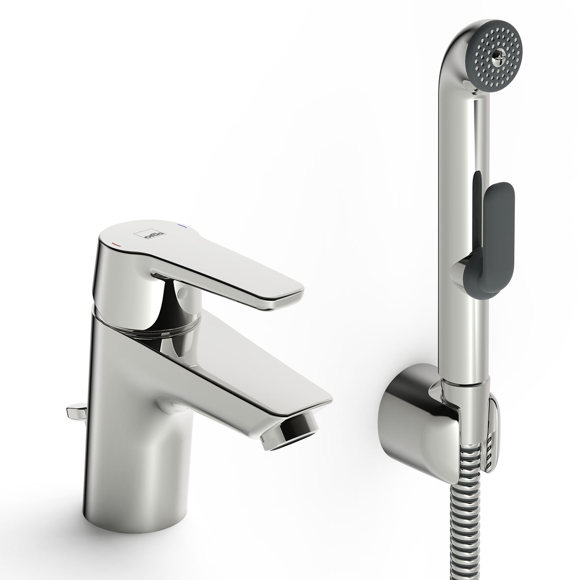 Tvättställsblandare med lyftventil och Bidetta handdusch. Fast utloppspip, strålsamlare, duschslang 1.5 m och väggfäste. Inbyggd spärr för begränsning av temperatur och flöde. Flödeskontroll 6 l/min. F=flexibel anslutning. G3/8" inv.G