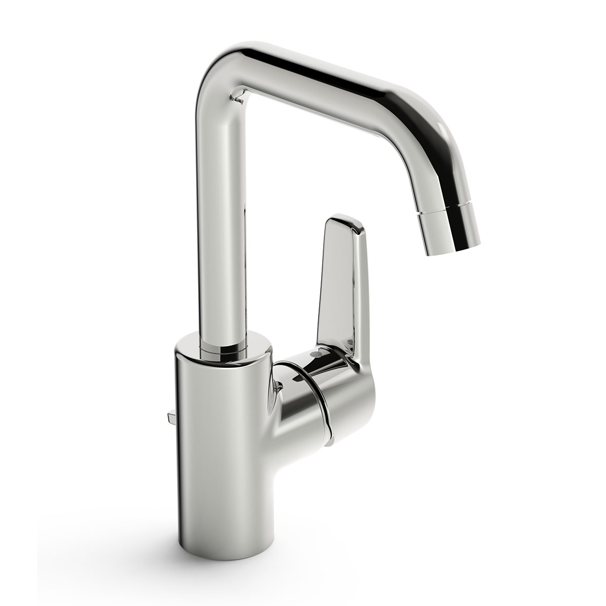 Tvättställsblandare med sidospak, hög svängbar utloppspip och lyftventil. Inbyggd spärr för begränsning av temperatur och flöde. Flödeskontroll 6.0 l/min. F=flexibel anslutning. G3/8" inv.G
