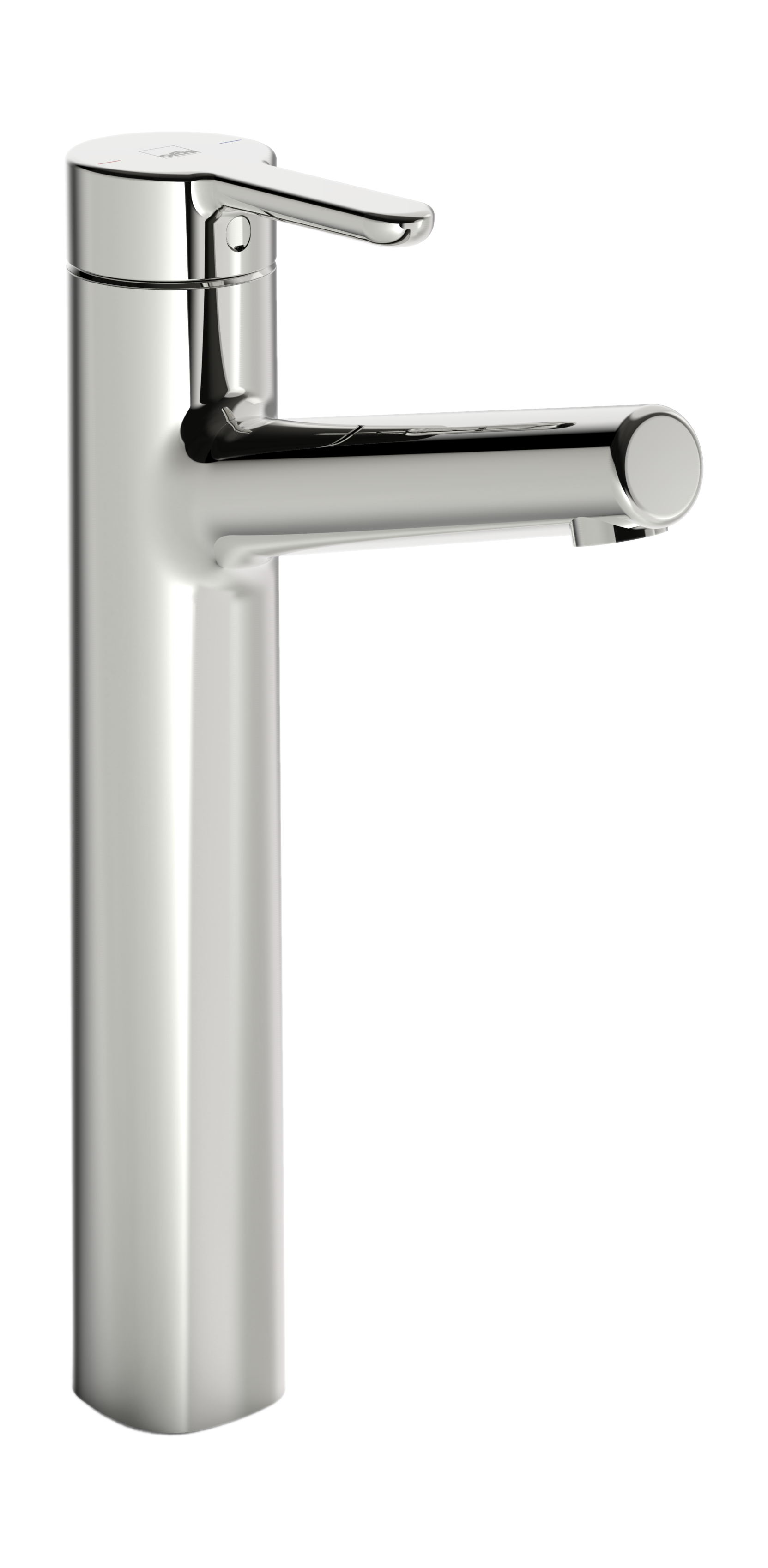 Hög tvättställsblandare med fast utloppspip och strålsamlare. F = flexibel anslutning.