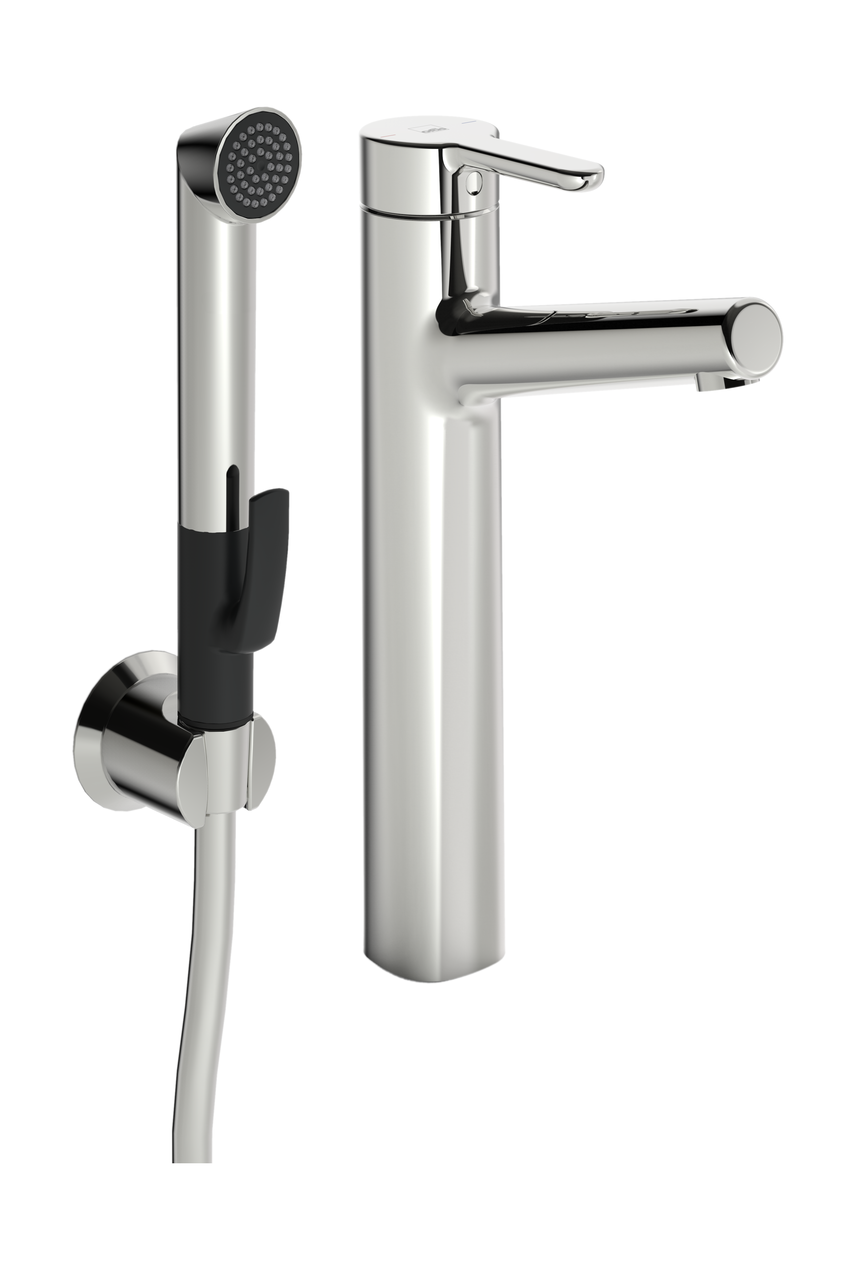 Hög tvättställsblandare med fast utloppspip, strålsamlare och Bidetta handdusch med duschslang och väggfäste. F = flexibel anslutning.