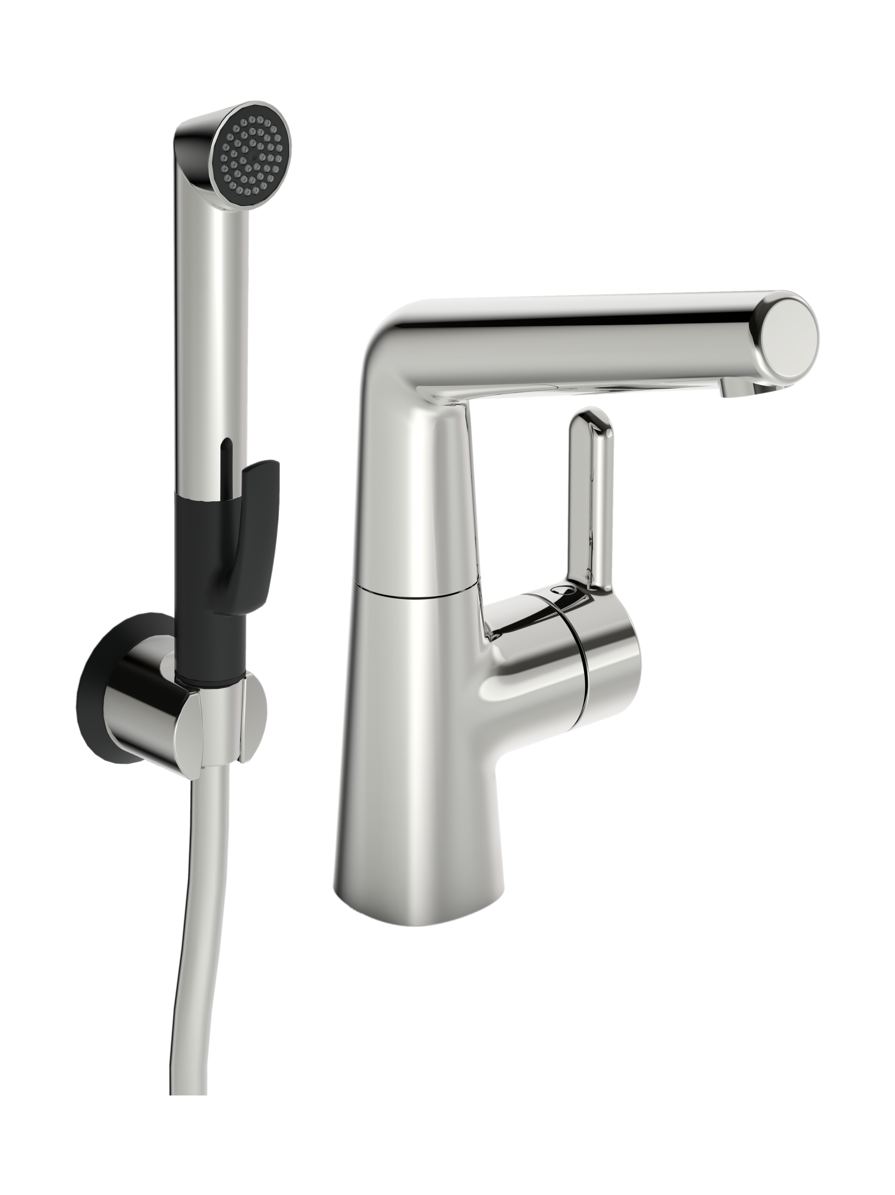 Tvättställsblandare med sidspak och fjärrstyrd Smart Bidetta. Kontrollenhet med termostatfunktion. Pipens svängradie är förinställd på 120° (kan begränsas till 0° eller 60°). För den fjärrstyrda handduschen Smart Bidetta: när man lyfter upp handduschen från hållaren börjar vattnet att flöda från blandaren. Trycker man in knappen kommer vattnet istället från handduschen. När handduschen sätts tillbaka i hållaren stängs flödet av automatiskt. F = flexibel anslutning. 6l/min - 300kPa. Oras patenterade infästningssystem 3S - för enkel och snabb installation.