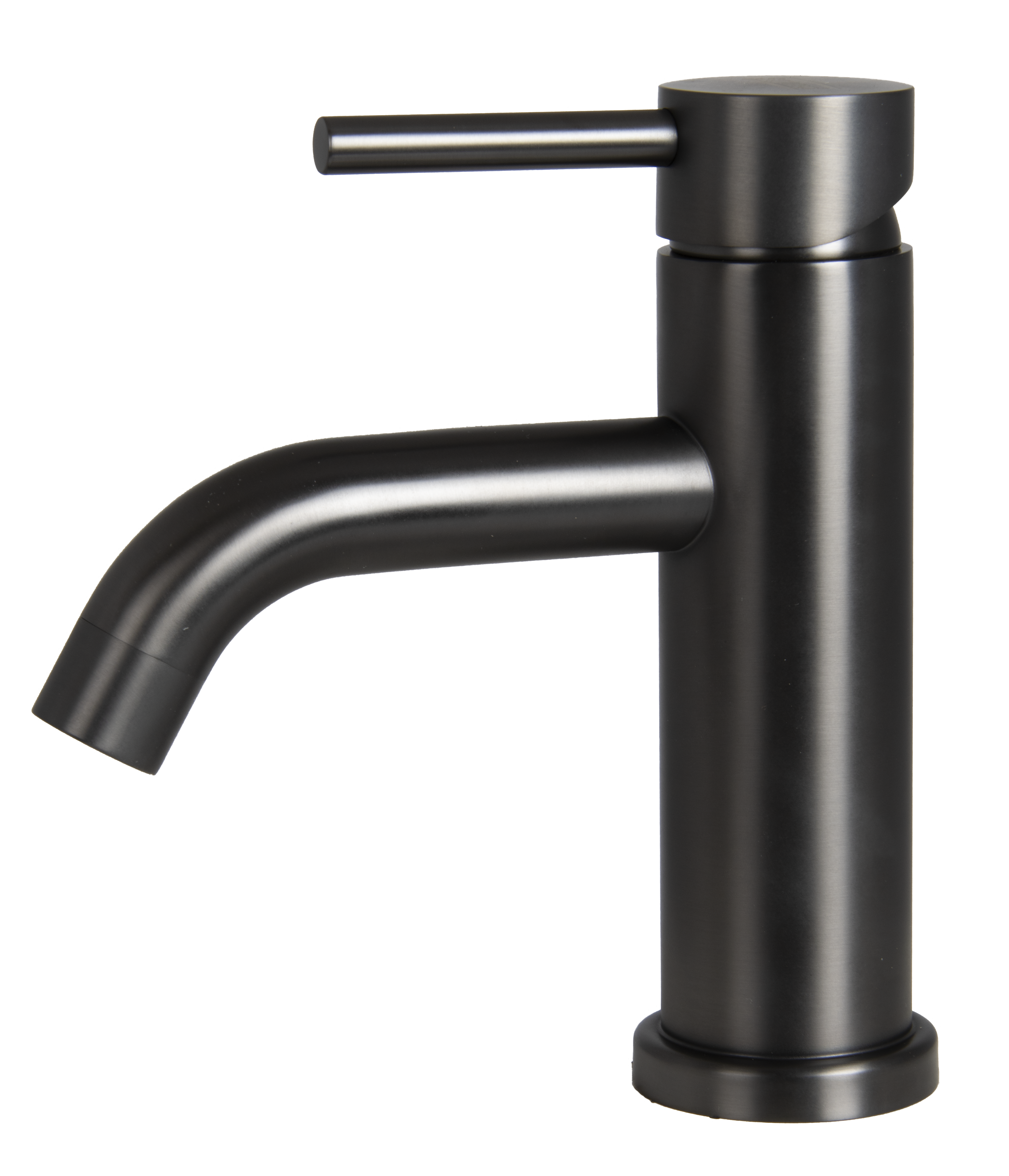 Tvättställsblandare i rostfritt stål, ettgrepp, böjd pip. gun-färg
