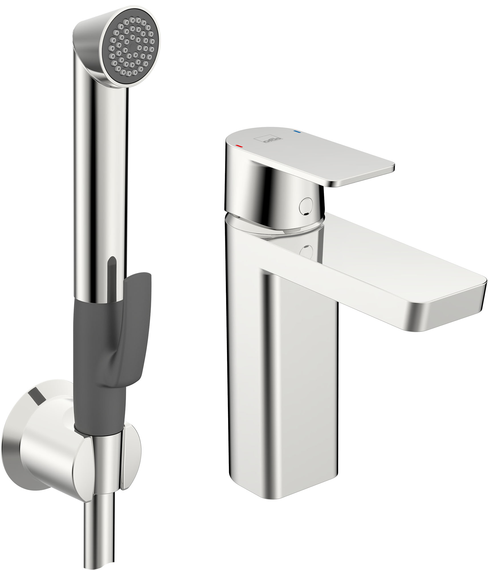 Tvättställsblandare med fast utloppspip, strålsamlare och Bidetta handdusch med duschslang 1,6m och väggfäste. Inbyggd spärr för begränsning av temperatur och flöde. F=flexibel anslutning.