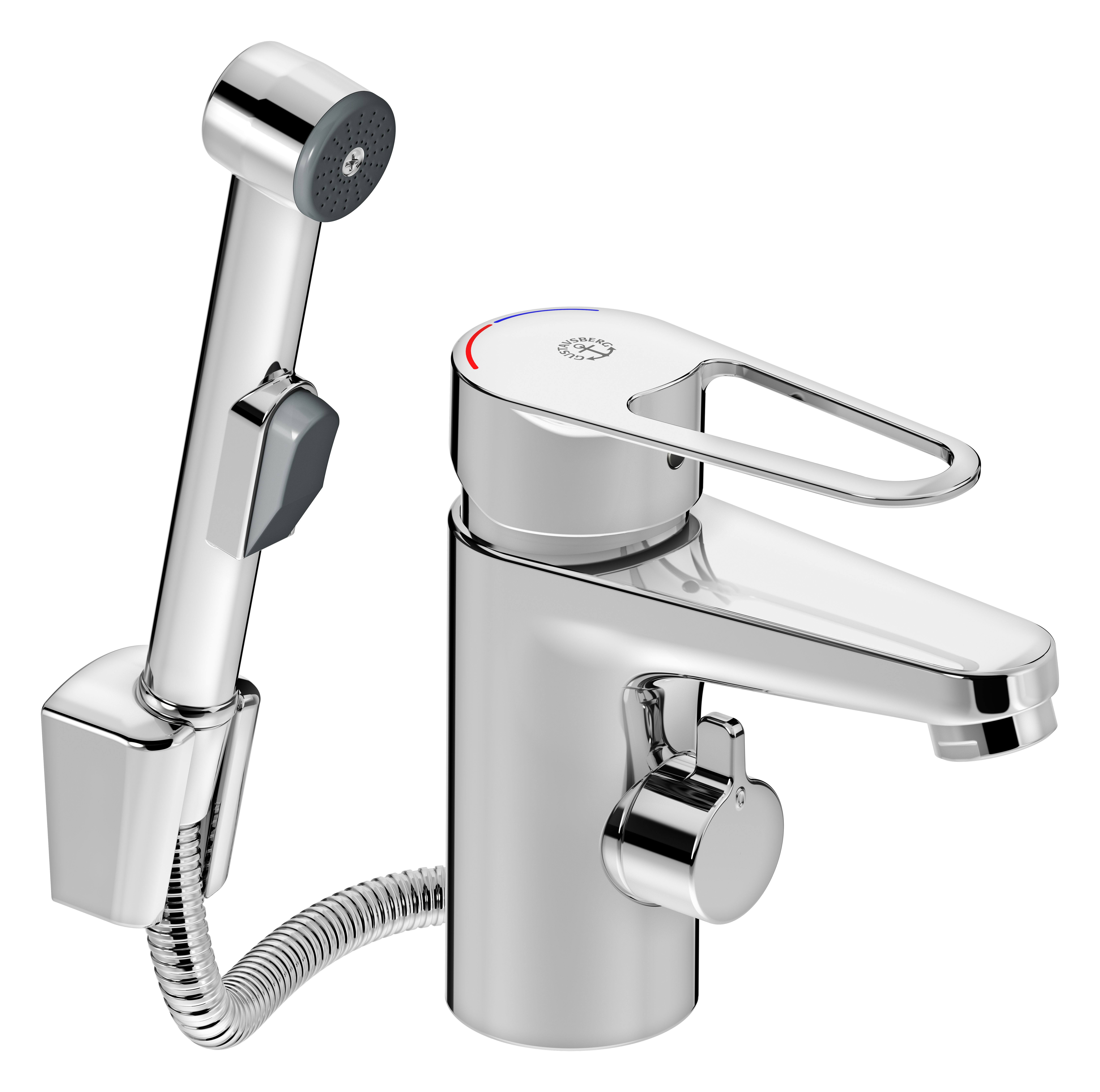 Greppvänlig spak med tydlig färgmarkering för varm- och kallvatten