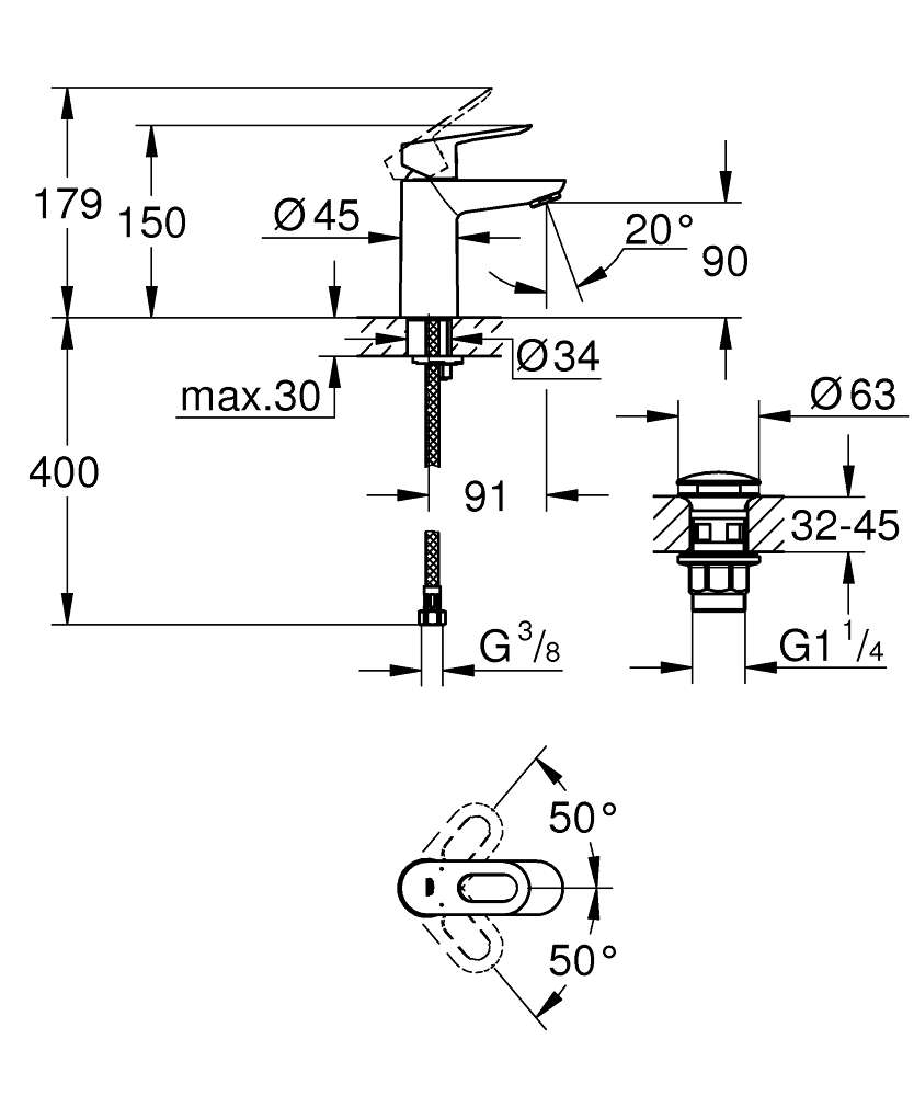 Start Loop, Tvättställsblandare ettgrepp, DN 15 S-Size, Etthålsmontage, Metallgrepp, GROHE Longlife 28 mm keramikinsats, krom yta, GROHE EcoJoy strålsamlare 5,7 l/min, Slät kropp, Avfalls-set med push-up öppningsplugg, Flexibla anslutningsslangar, GROHE QuickFix system för snabb montering