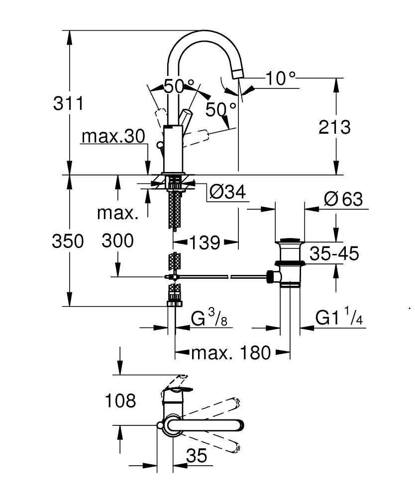 Start, Tvättställsblandare ettgrepp ½" L-Size, Etthålsmontage, Metallgrepp, GROHE SilkMove 28 mm keramisk insats, Med temperaturbegränsare, GROHE StarLight kromyta, GROHE EcoJoy strålsamlare 5,7 l/min, Svängbar pip, Vridningsområde 360°, Flexibla anslutningsslangar, Bottenventil 1 1/4", GROHE QuickFix snabbt installationssystem