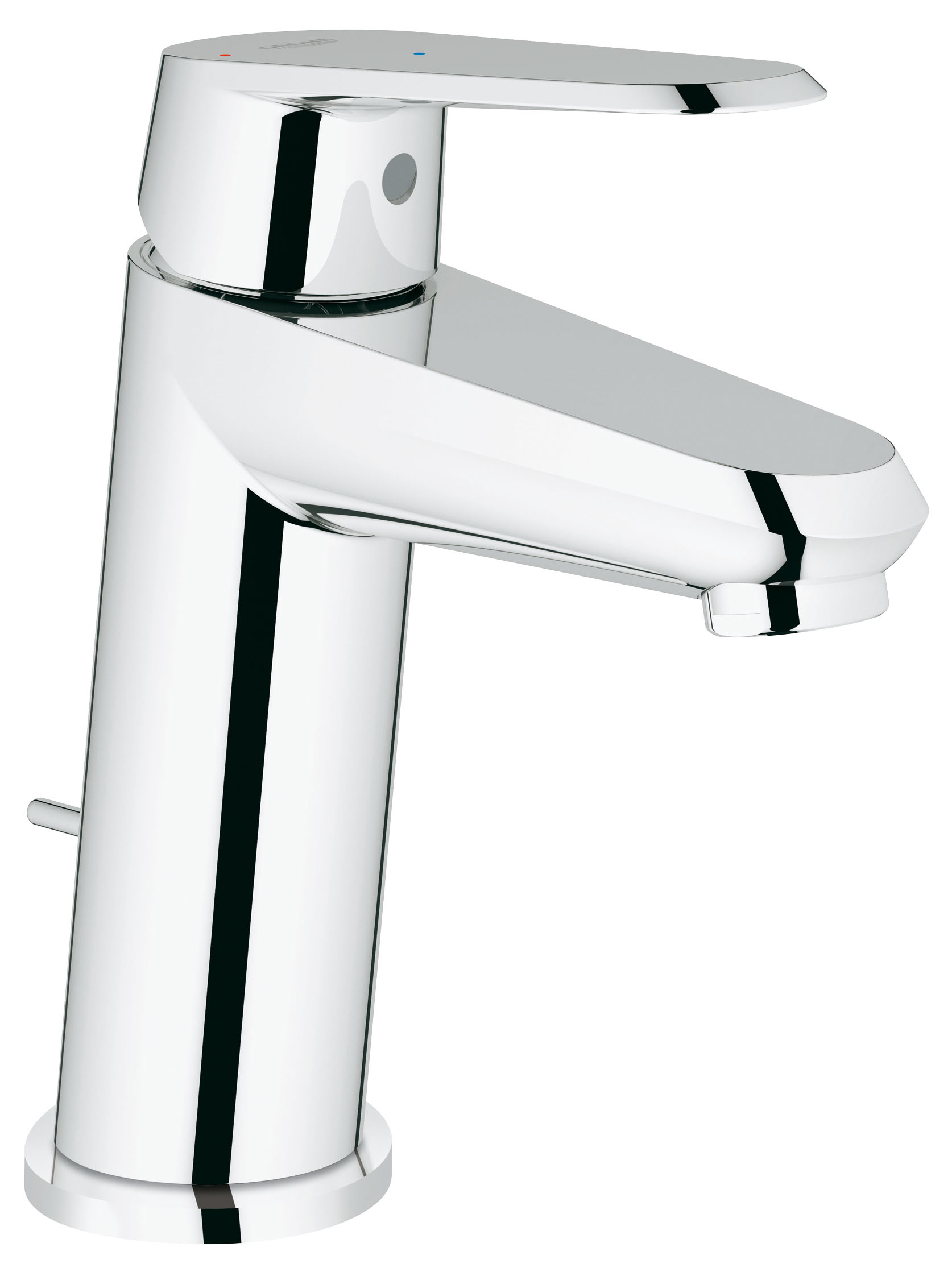 Eurodisc Cosmopolitan Tvättställsblandare ettgrepp, DN 15 S-Size Etthålsmontage, Metallgrepp, GROHE SilkMove ES 28 mm keramisk insats med energibeparande funktion via kallstart, Med temperaturbegränsare, GROHE StarLight kromyta, GROHE EcoJoy strålsamlare 5,7 l/min, GROHE QuickFix Plus snabbt installationssystem, Bottenventil 1 1/4", Flexibla anslutningsslangar, Lägsta tryck: 1,0 bar