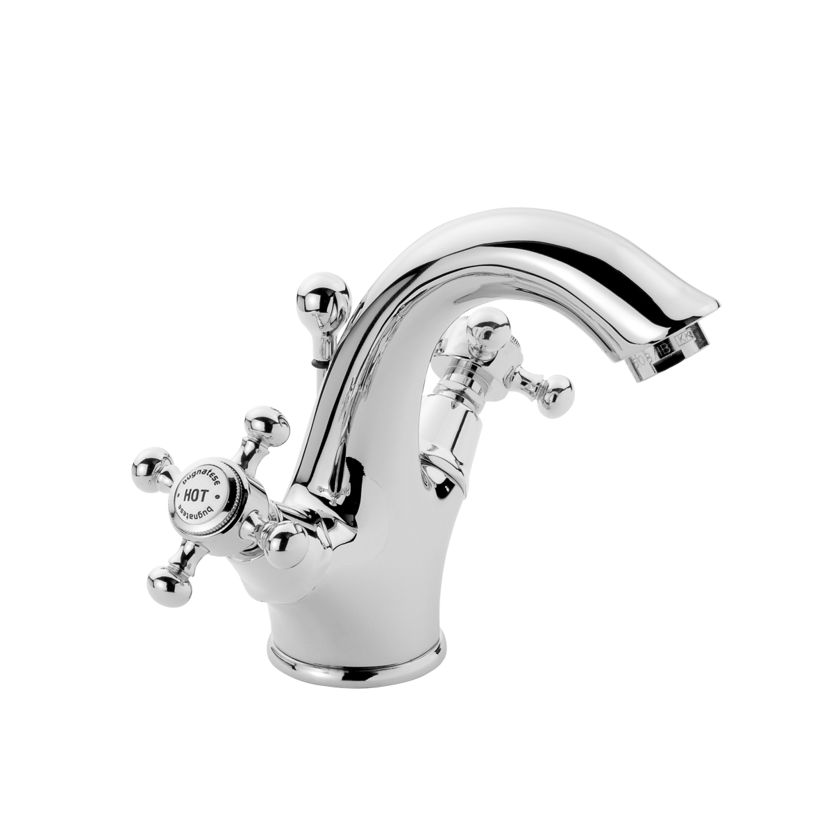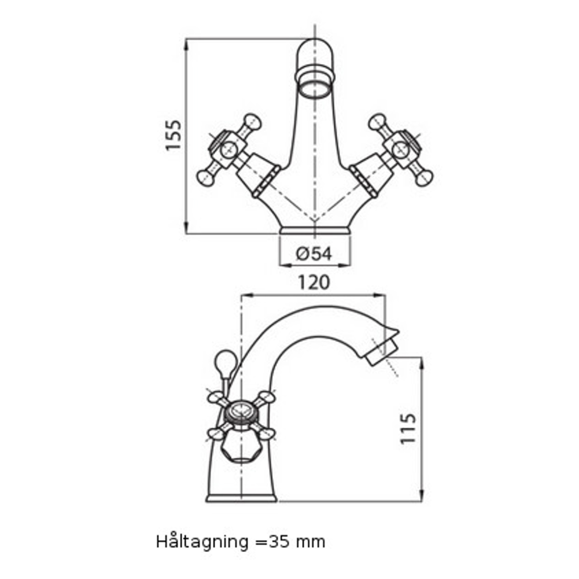 Tvågrepps tvättställsblandare med fast pip och vita detaljer. Passar 35mm hål. Finns i 7 olika ytbehandlingar