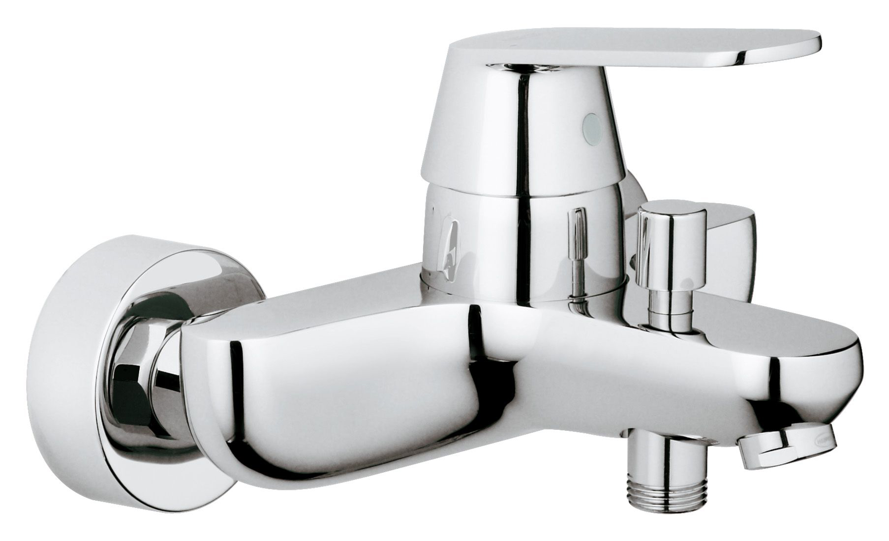 Eurosmart Cosmopolitan Ettgreppsblandare för badkar & dusch, DN 15 Väggmontage, Metallgrepp, GROHE SilkMove 46 mm keramisk insats, GROHE StarLight kromyta, Inställbar flödesbegränsare, Inställbart minimumflöde 2,5 l/min, Automatisk omkastning: badkar/dusch, Perlator för verktygsfritt utbyte, Integrerad kontraventil i duschutloppet 1/2", S-anslutningar, Backventil mot tillbakaflöde, Temperaturbegränsare som tillval (46 308), Ljudklassad DIN 4109
