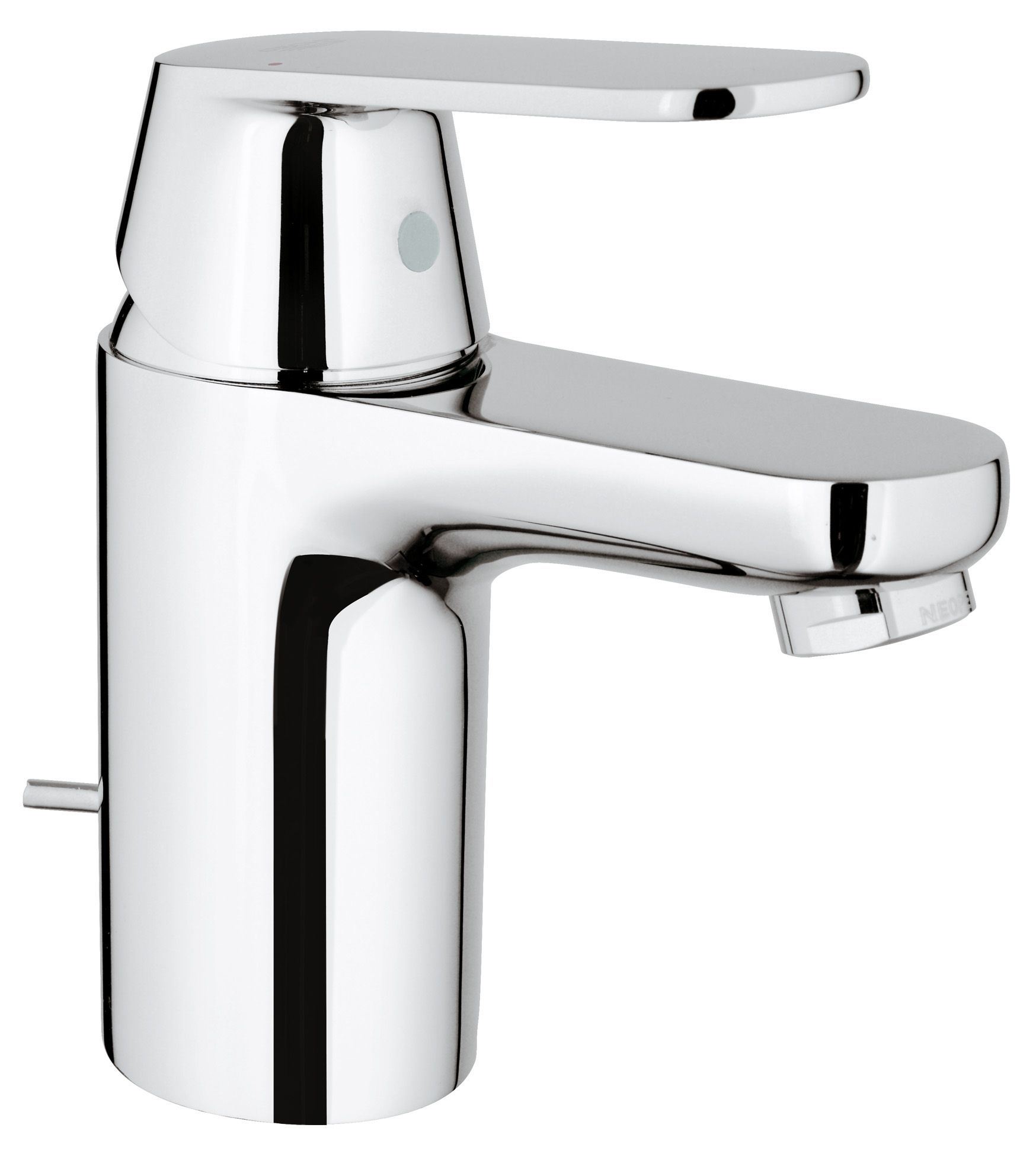 Eurosmart Cosmopolitan tvättställsblandare, DN 15 i storlek S. Tvättställsblandaren har etthålsmontage och metallgrepp. Den är utrustad med en GROHE Filklove 35 mm keramikinsats, temperaturbegränsare, GROHE EcoJoy, inställbart flödesbegränsare och inställbart minimumflöde 2,5 l/min. Rengöring är enkel tack vare GROHE SpeedClean och den kromade GROHE StarLight-ytbehandlingen. Installationen sker snabbt genom GROHE QuickFix och flexibla anslutningsslangar.