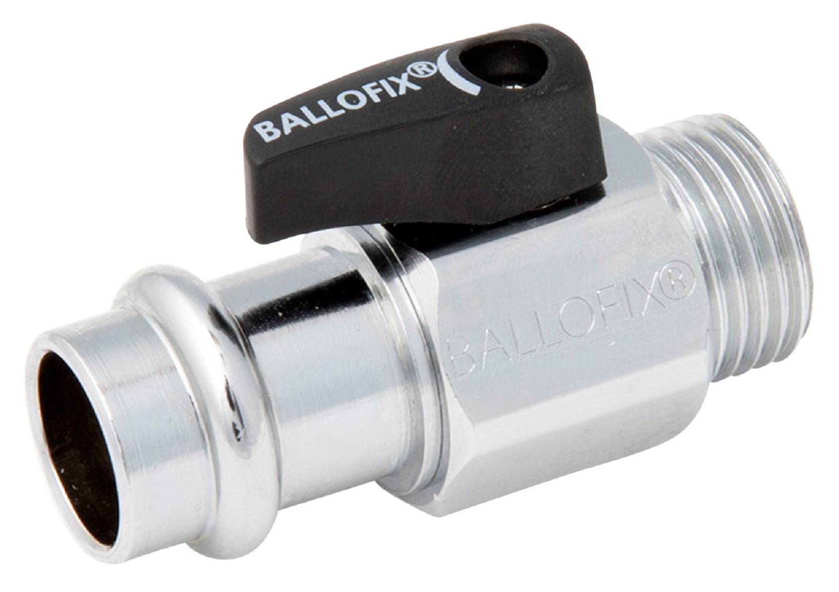 Ballofix 543 Rak kulventil 12xR15, med presskoppling x utvändig gänga förkromad med vred