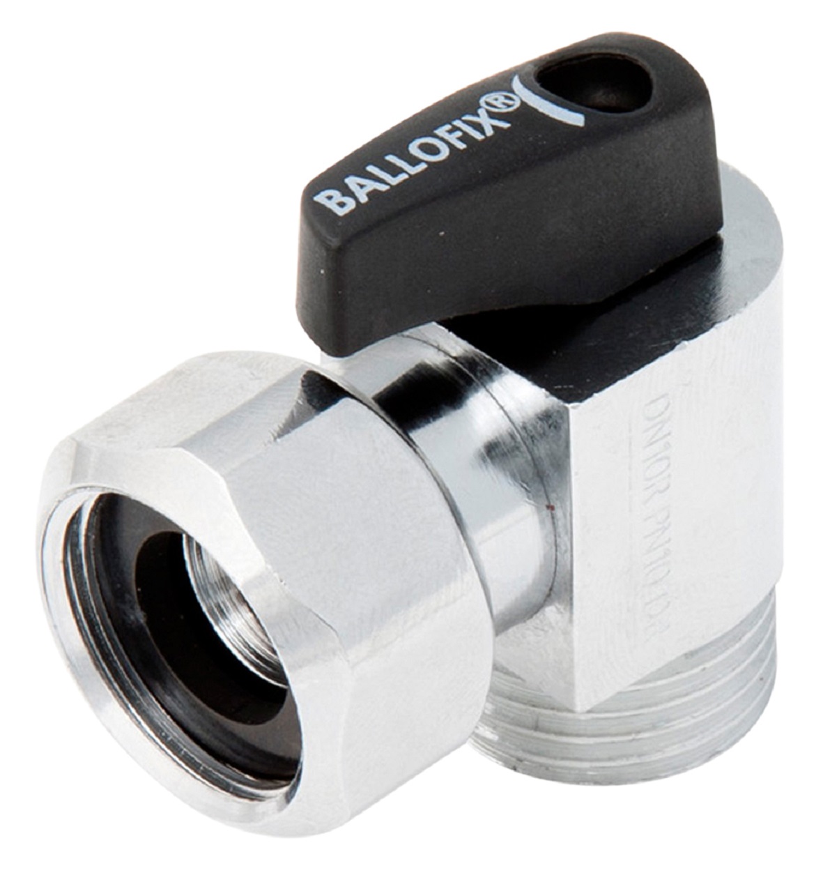Ballofix 524 Vinkel kulventil R15xR15, med utvändig gänga x invändig gängad med lekande mutter förkromad med vred
