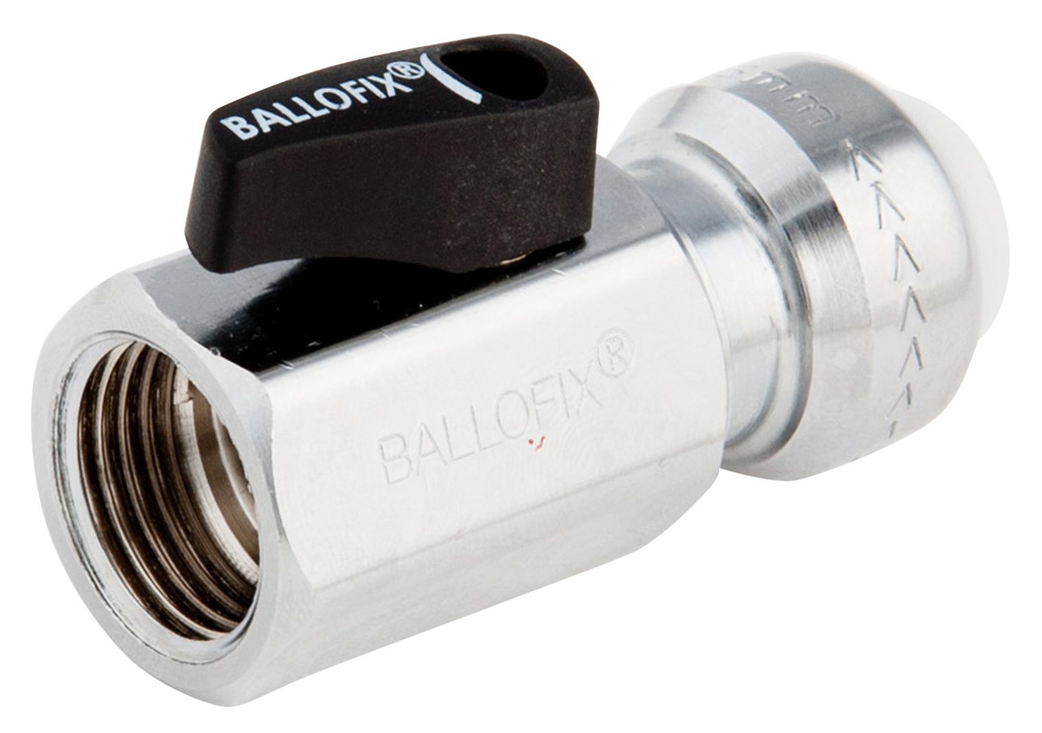Ballofix 553 Rak kulventil 10xR15, med pushkoppling x invändig gänga förkromad utan vred