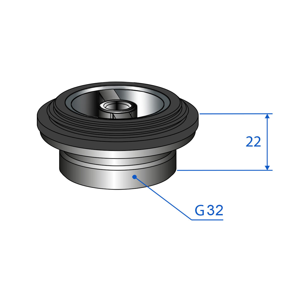 Underdel till bottenventil i metall. Byggmått:22 mm.